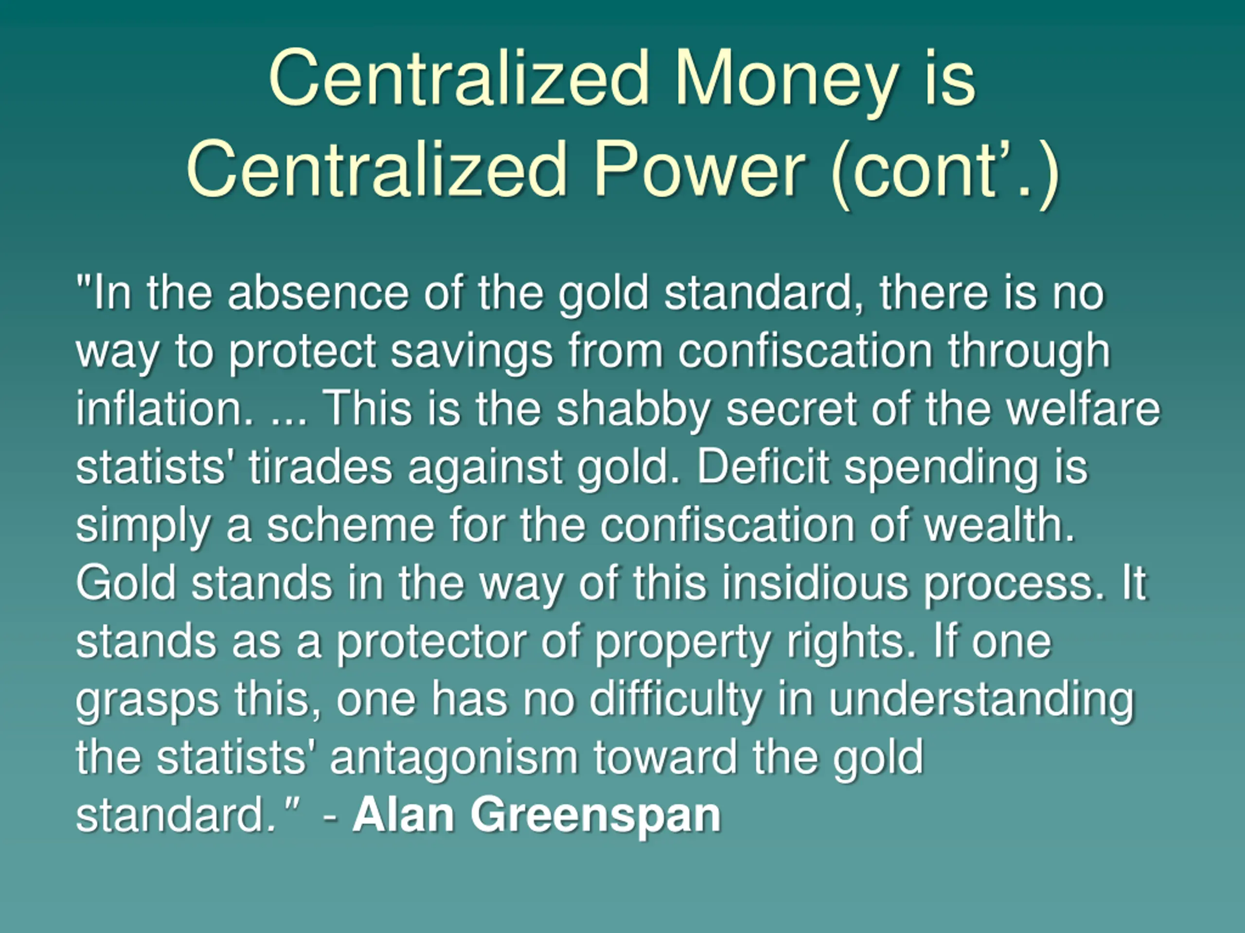 Centralized Money is Centralized Power (cont .) "In the absence of the gold standard, there is no way to protect savings from confiscation through inflation. ... This is the shabby secret of the welfare statists' tirades against gold. Deficit spending is simply a scheme for the confiscation of wealth. Gold stands in the way of this insidious process. It stands as a protector of property rights. If one grasps this, one has no difficulty in understanding the statists' antagonism toward the gold standard." - Alan Greenspan