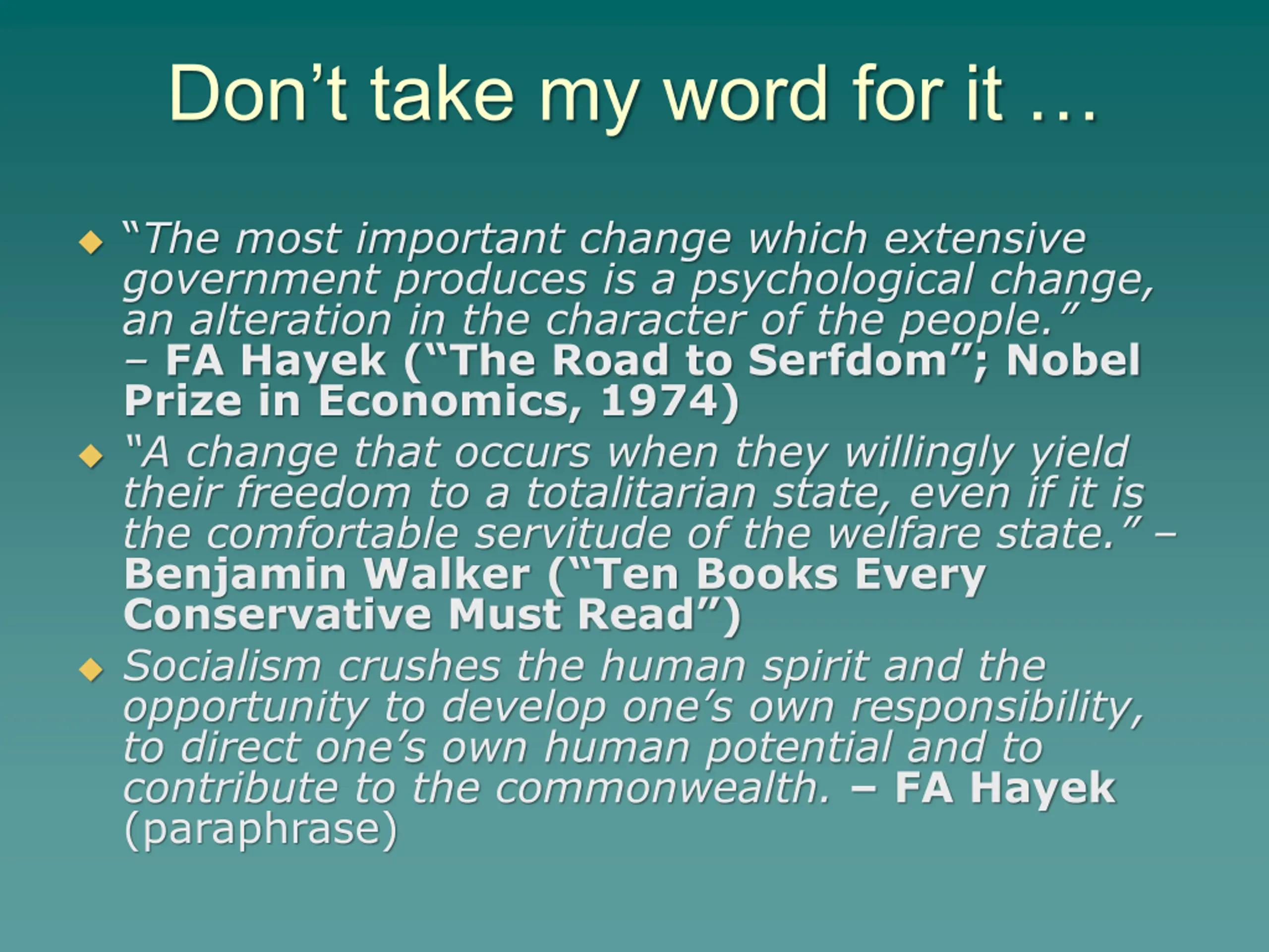Dont take my word for it The most important change which extensive government produces is a psychological change, an alteration in the character of the people. FA Hayek ( The Road to Serfdom ; Nobel Prize in Economics, 1974) A change that occurs when they willingly yield their freedom to a totalitarian state, even if it is the comfortable servitude of the welfare state. Benjamin Walker ( Ten Books Every Conservative Must Read ) Socialism crushes the human spirit and the opportunity to develop one s own responsibility, to direct one s own human potential and to contribute to the commonwealth. FA Hayek (paraphrase)
