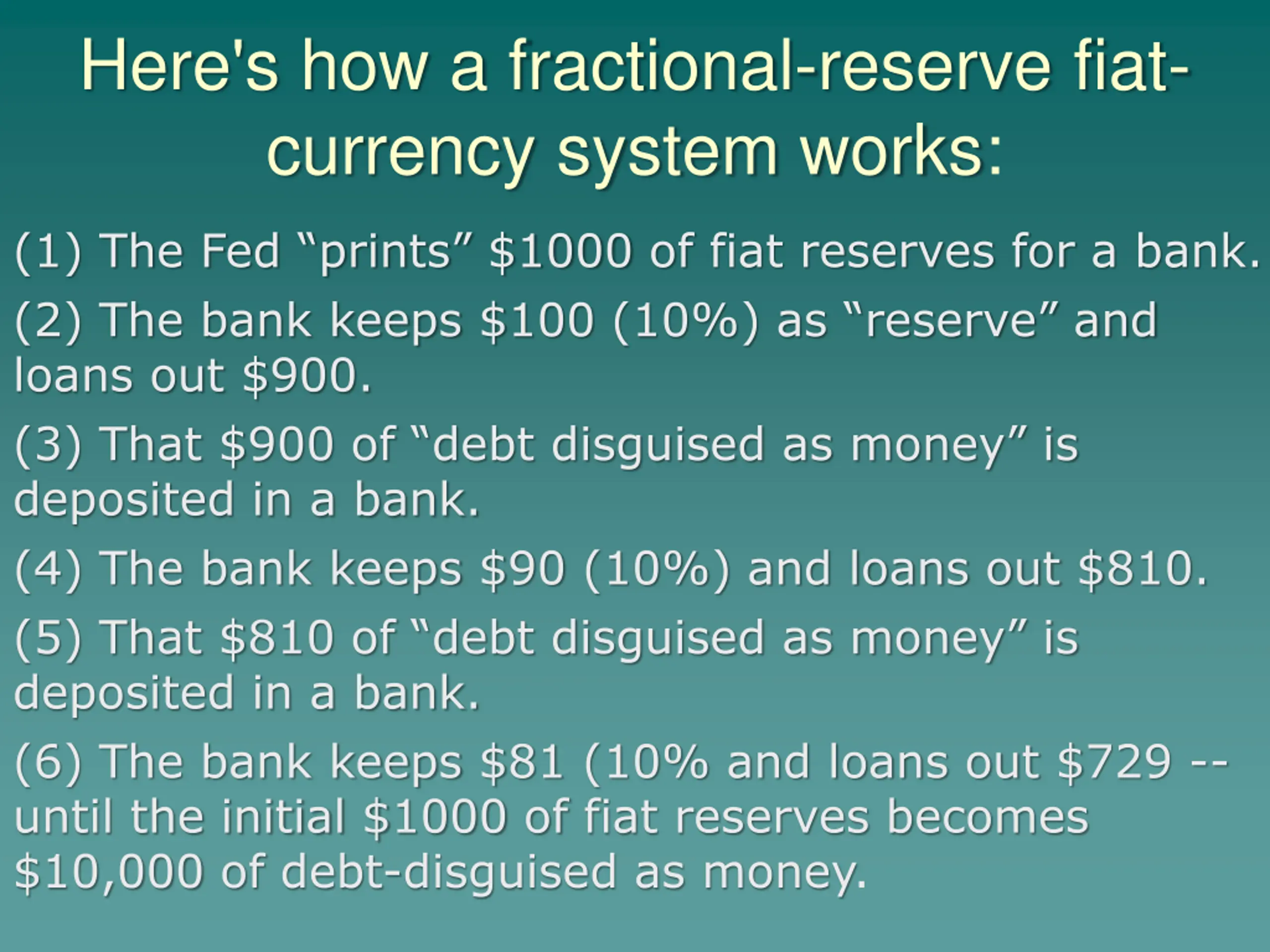 Here's how a fractional-reserve fiat- currency system works: (1) The Fed prints $1000 of fiat reserves for a bank. (2) The bank keeps $100 (10%) as reserve and loans out $900. (3) That $900 of debt disguised as money is deposited in a bank. (4) The bank keeps $90 (10%) and loans out $810. (5) That $810 of debt disguised as money is deposited in a bank. (6) The bank keeps $81 (10% and loans out $729 -- until the initial $1000 of fiat reserves becomes $10,000 of debt-disguised as money.