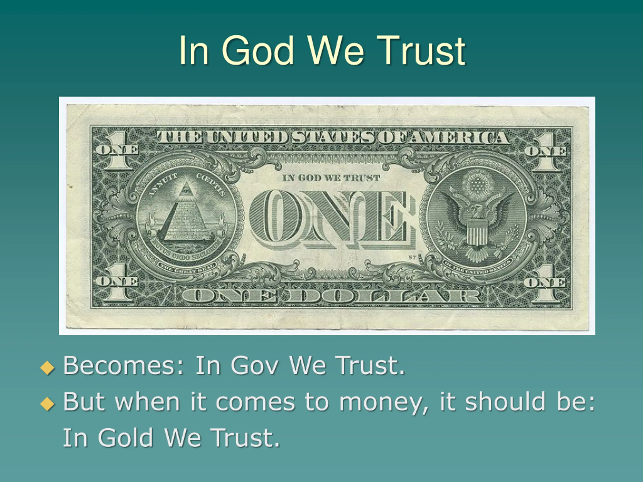 In God We Trust Becomes: In Gov We Trust. But when it comes to money, it should be: In Gold We Trust.