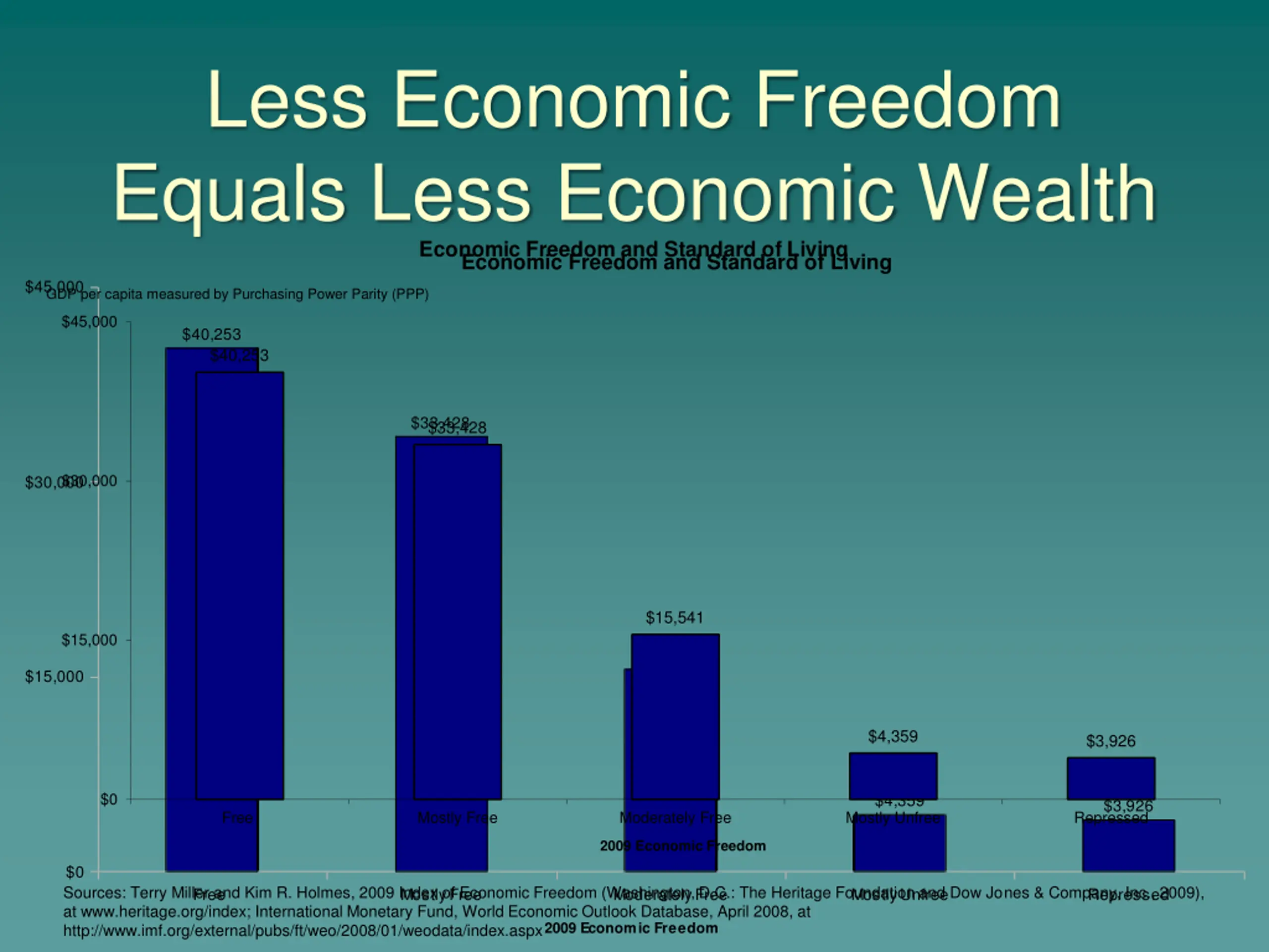 Less Economic Freedom Equals Less Economic Wealth Economic Freedom and Standard of Living Economic Freedom and Standard of Living $45,000 GDP per capita measured by Purchasing Power Parity (PPP) $45,000 $40,253 $40,253 $33,428 $33,428 $30,000 $30,000 $15,541 $15,000 $15,541 $15,000 $4,359 $3,926 $0 $4,359 $3,926 Free Mostly Free Moderately Free Mostly Unfree Repressed 2009 Economic Freedom $0 Sources: Terry Miller and Kim R. Holmes, 2009 Index of Economic Freedom (Washington, D.C.: The Heritage Foundation and Dow Jones & Company, Inc., 2009), at www.heritage.org/index; International Monetary Fund, World Economic Outlook Database, April 2008, at http://www.imf.org/external/pubs/ft/weo/2008/01/weodata/index.aspx Free Mostly Free Moderately Free Mostly Unfree Repressed 2009 Economic Freedom