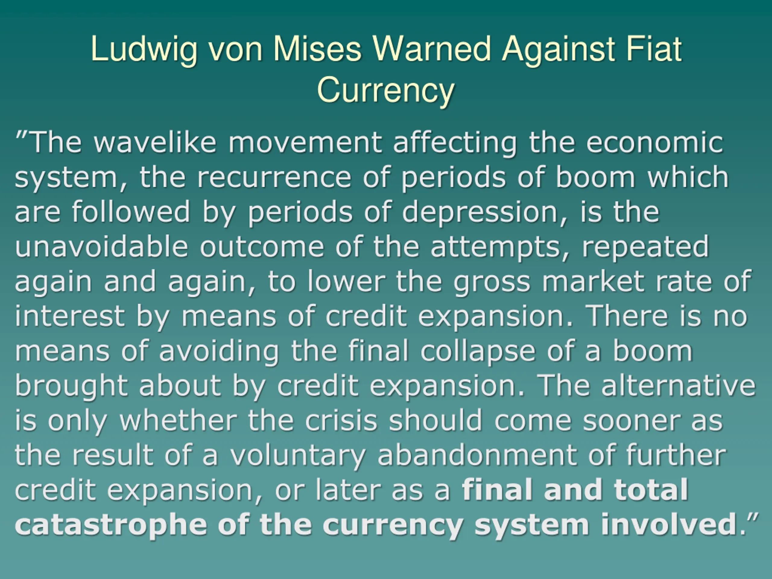 Ludwig von Mises Warned Against Fiat Currency The wavelike movement affecting the economic system, the recurrence of periods of boom which are followed by periods of depression, is the unavoidable outcome of the attempts, repeated again and again, to lower the gross market rate of interest by means of credit expansion. There is no means of avoiding the final collapse of a boom brought about by credit expansion. The alternative is only whether the crisis should come sooner as the result of a voluntary abandonment of further credit expansion, or later as a final and total catastrophe of the currency system involved.