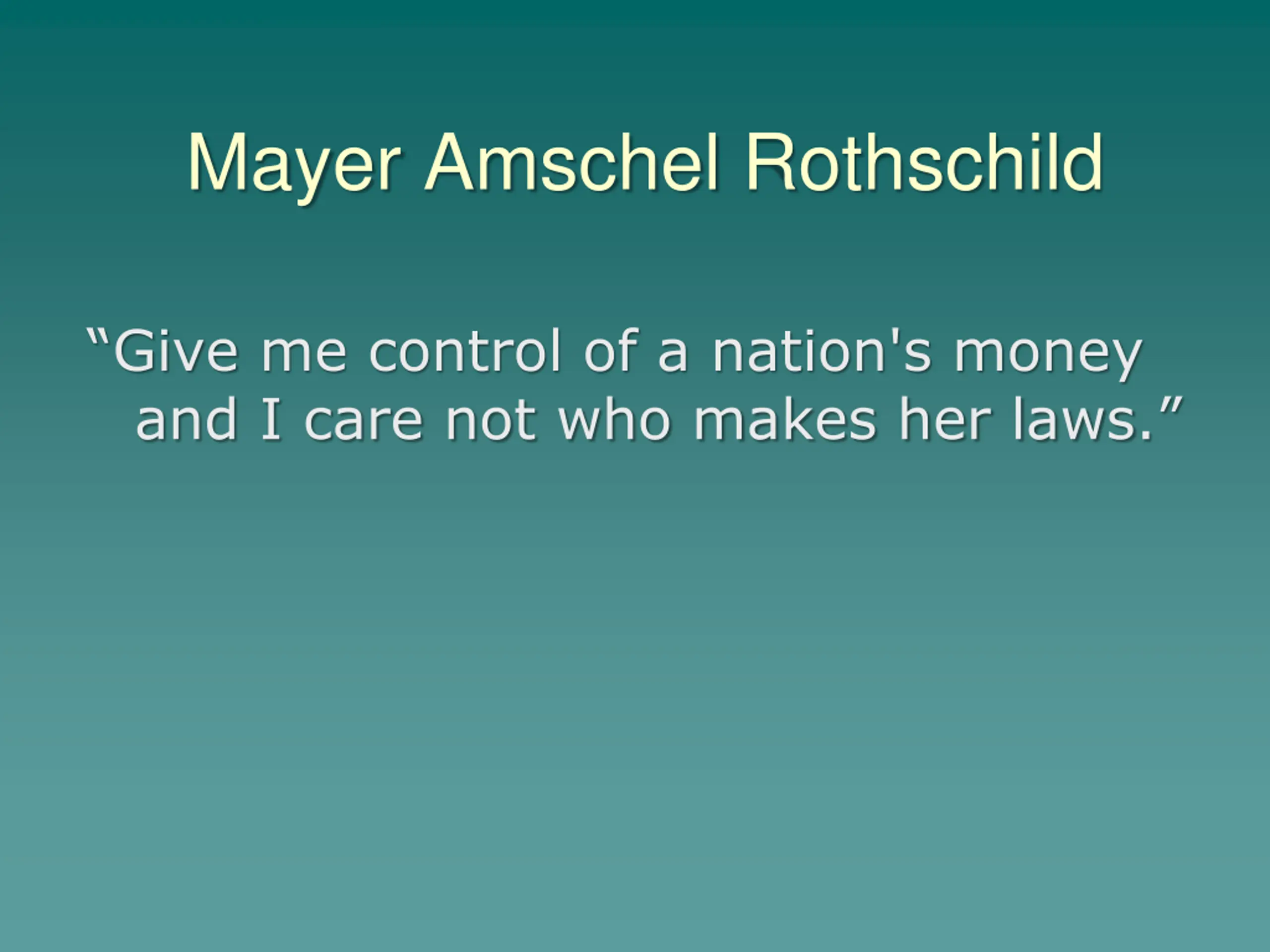 Mayer Amschel Rothschild Give me control of a nation's money and I care not who makes her laws.