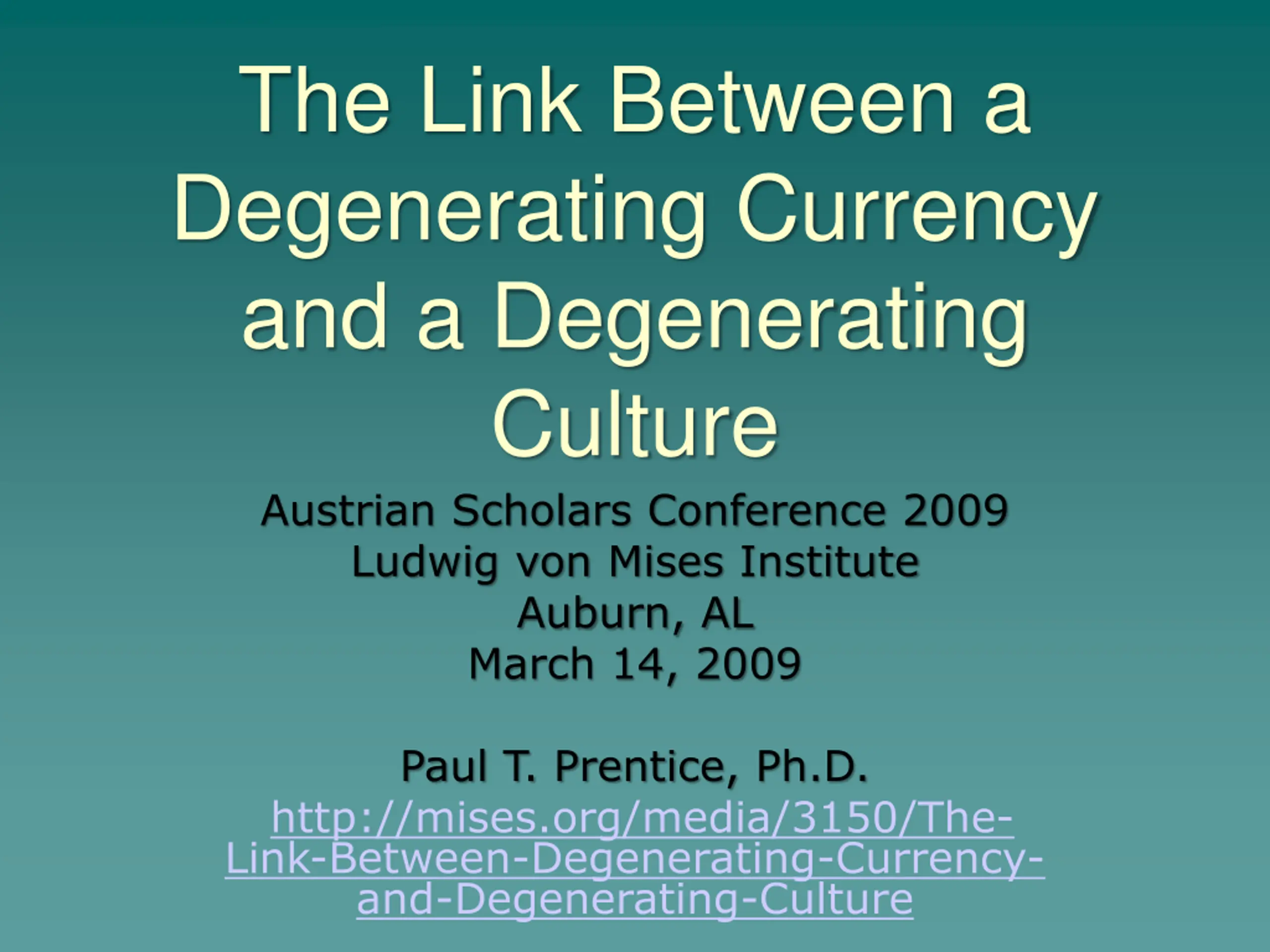 The Link Between a Degenerating Currency and a Degenerating Culture Austrian Scholars Conference 2009 Ludwig von Mises Institute Auburn, AL March 14, 2009 Paul T. Prentice, Ph.D. http://mises.org/media/3150/The- Link-Between-Degenerating-Currency- and-Degenerating-Culture