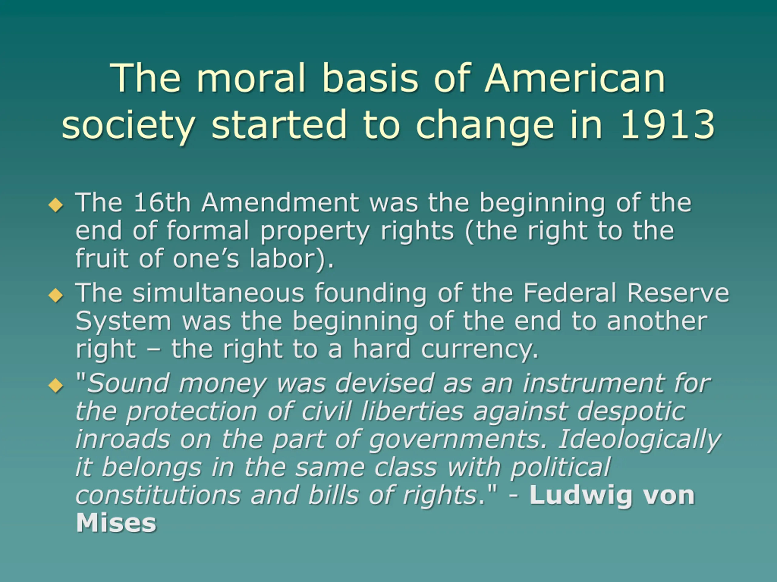 The moral basis of American society started to change in 1913 The 16th Amendment was the beginning of the end of formal property rights (the right to the fruit of one s labor). The simultaneous founding of the Federal Reserve System was the beginning of the end to another right the right to a hard currency. "Sound money was devised as an instrument for the protection of civil liberties against despotic inroads on the part of governments. Ideologically it belongs in the same class with political constitutions and bills of rights." - Ludwig von Mises