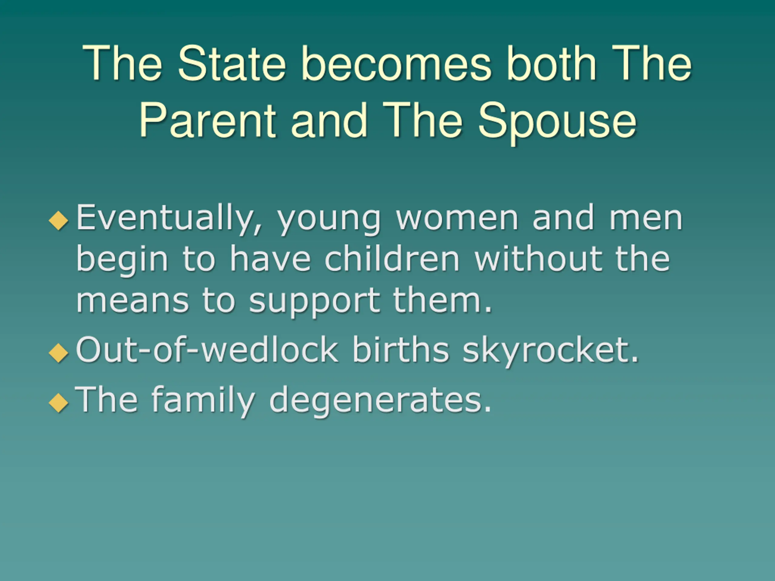 The State becomes both The Parent and The Spouse Eventually, young women and men begin to have children without the means to support them. Out-of-wedlock births skyrocket. The family degenerates.