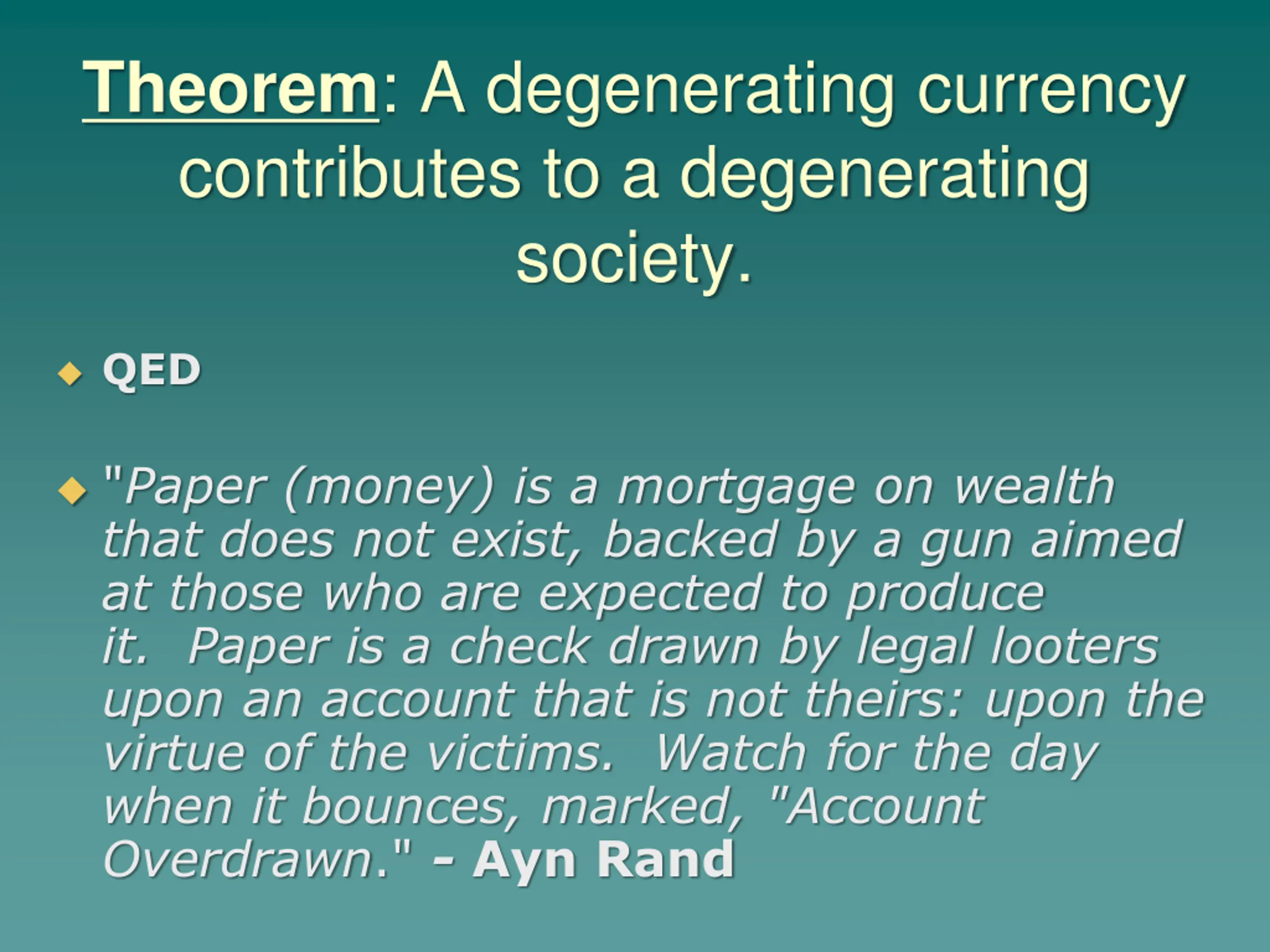 Theorem: A degenerating currency contributes to a degenerating society. QED "Paper (money) is a mortgage on wealth that does not exist, backed by a gun aimed at those who are expected to produce it. Paper is a check drawn by legal looters upon an account that is not theirs: upon the virtue of the victims. Watch for the day when it bounces, marked, "Account Overdrawn." - Ayn Rand