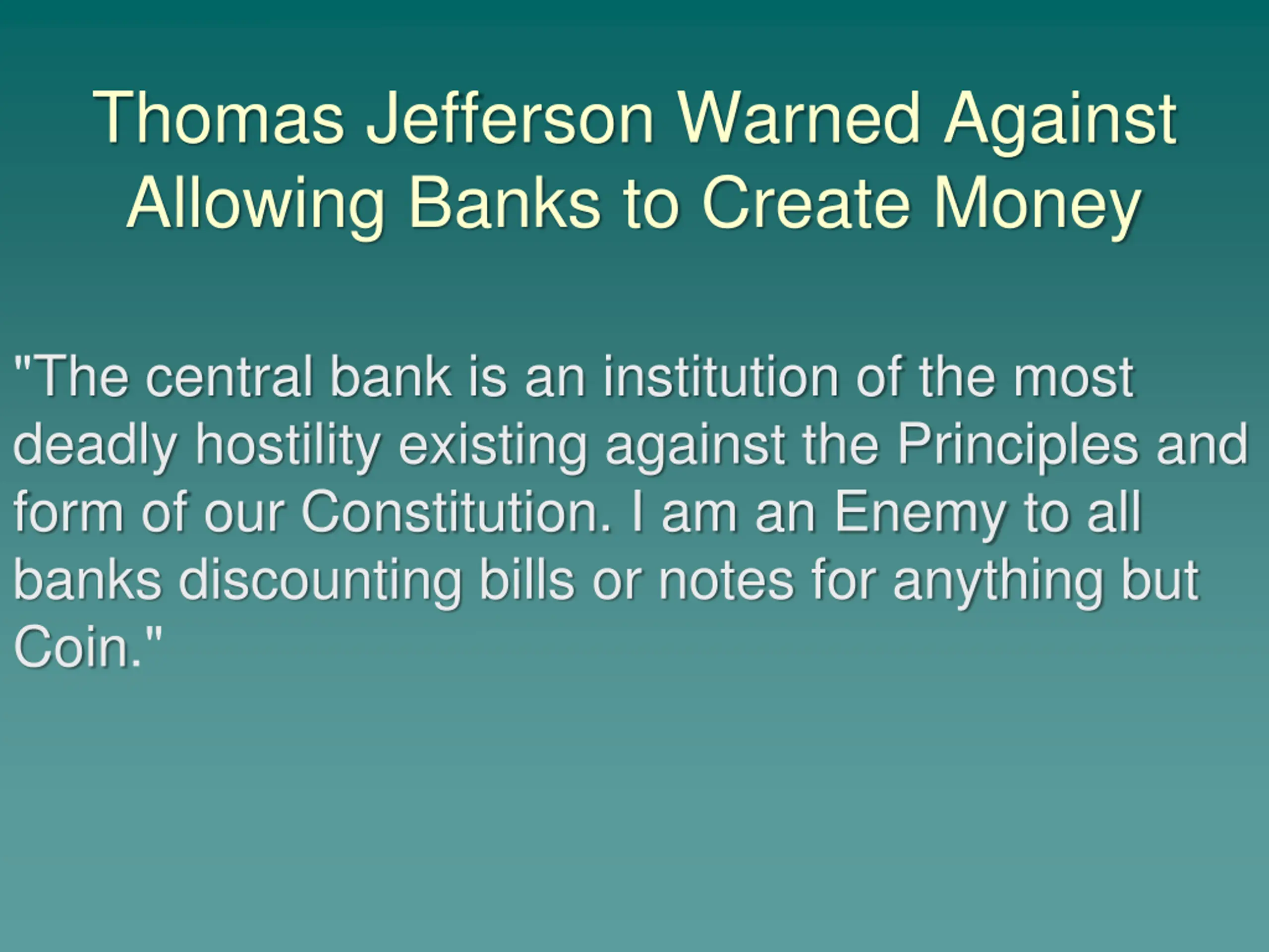 Thomas Jefferson Warned Against Allowing Banks to Create Money "The central bank is an institution of the most deadly hostility existing against the Principles and form of our Constitution. I am an Enemy to all banks discounting bills or notes for anything but Coin."