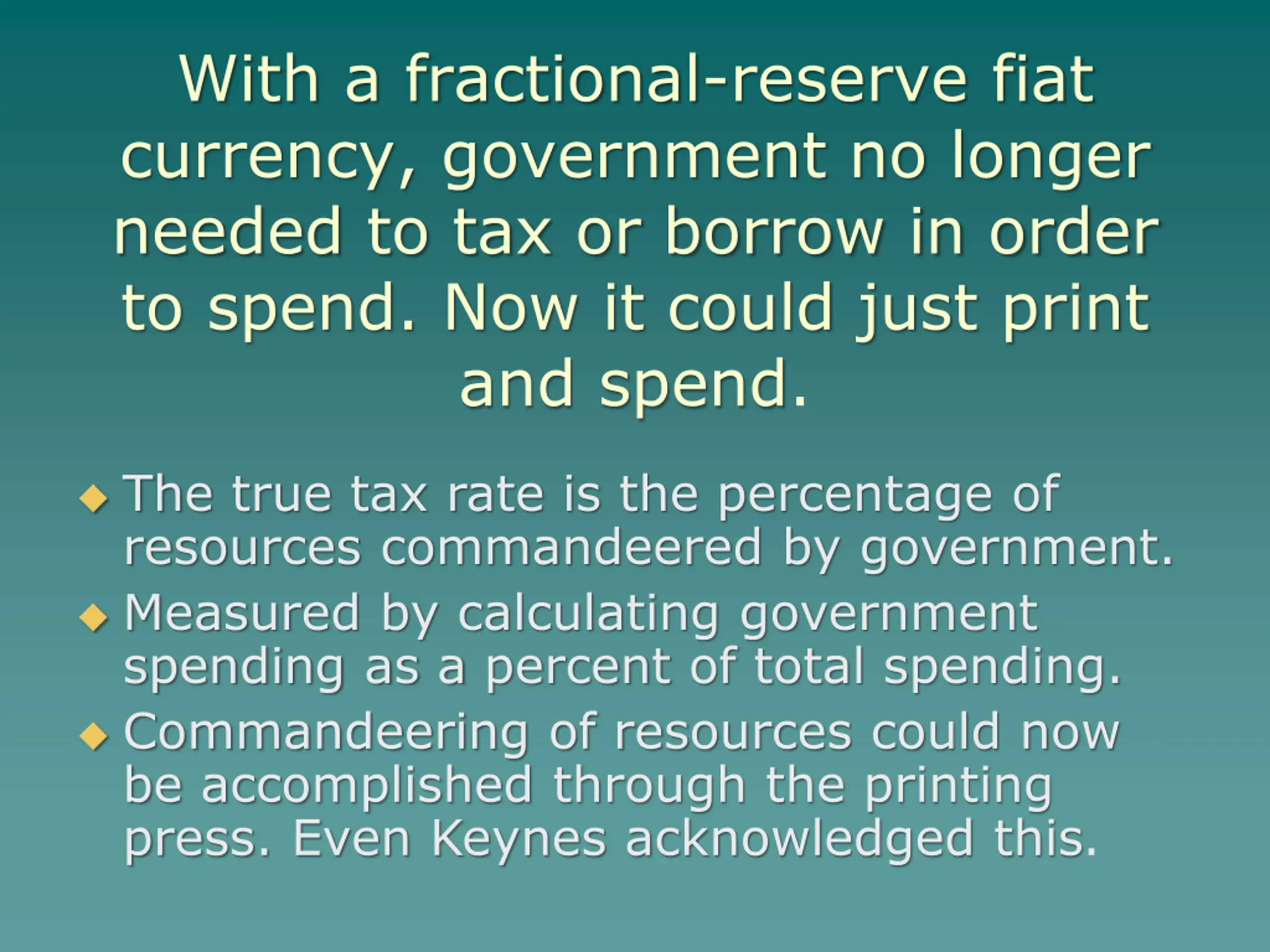With a fractional-reserve fiat currency, government no longer needed to tax or borrow in order to spend. Now it could just print and spend. The true tax rate is the percentage of resources commandeered by government. Measured by calculating government spending as a percent of total spending. Commandeering of resources could now be accomplished through the printing press. Even Keynes acknowledged this.