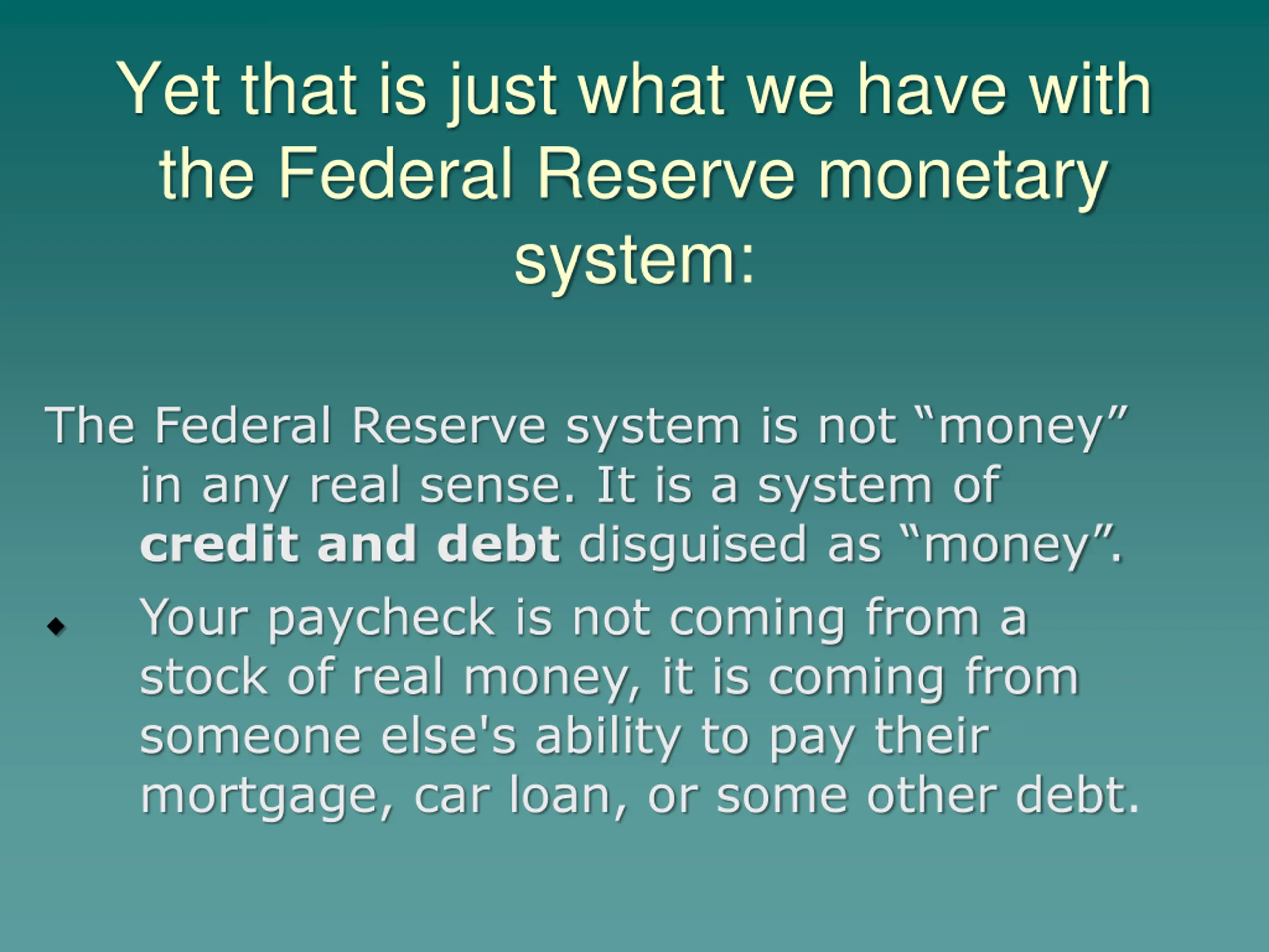 Yet that is just what we have with the Federal Reserve monetary system: The Federal Reserve system is not money in any real sense. It is a system of credit and debtdisguised as money . Your paycheck is not coming from a stock of real money, it is coming from someone else's ability to pay their mortgage, car loan, or some other debt.
