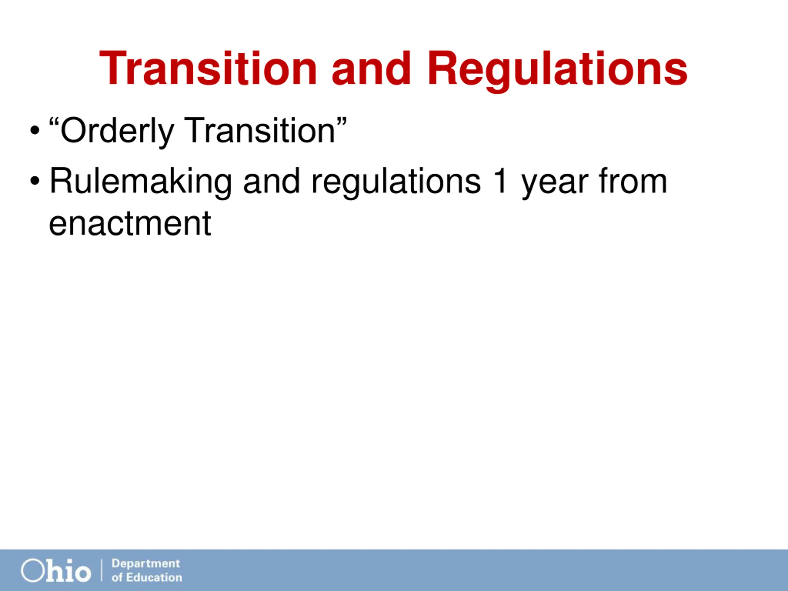 Transition and Regulations Orderly Transition Rulemaking and regulations 1 year from enactment