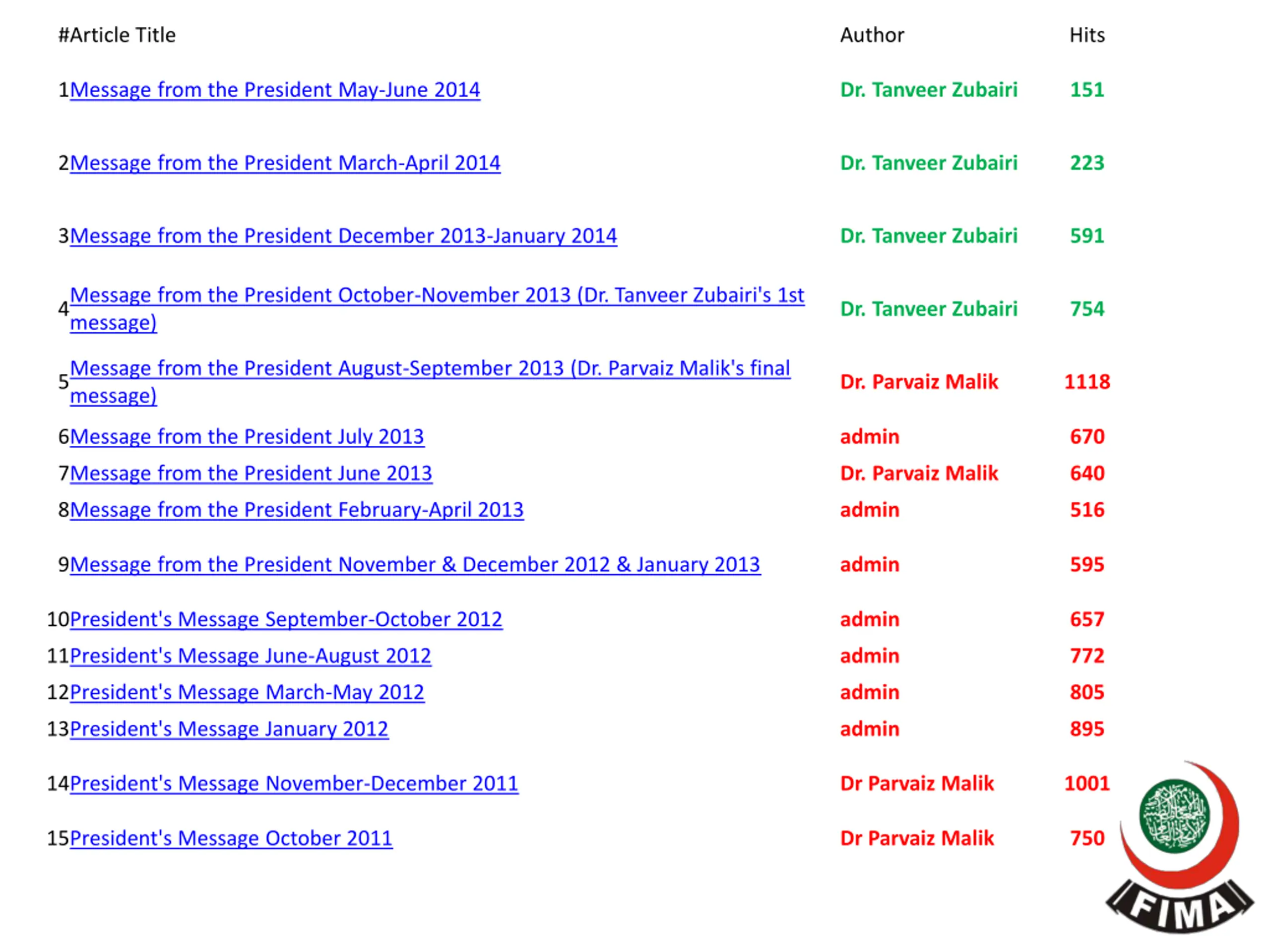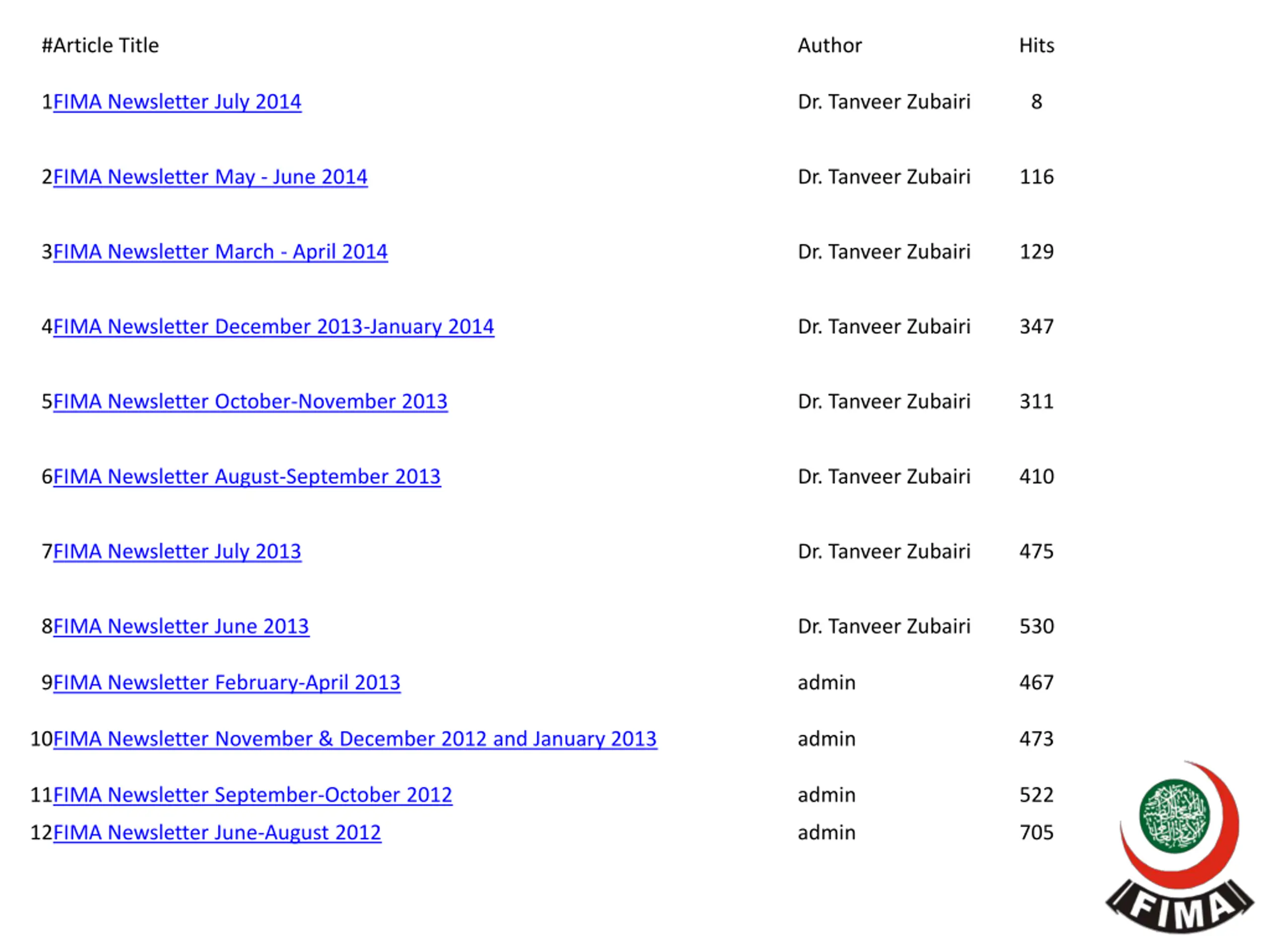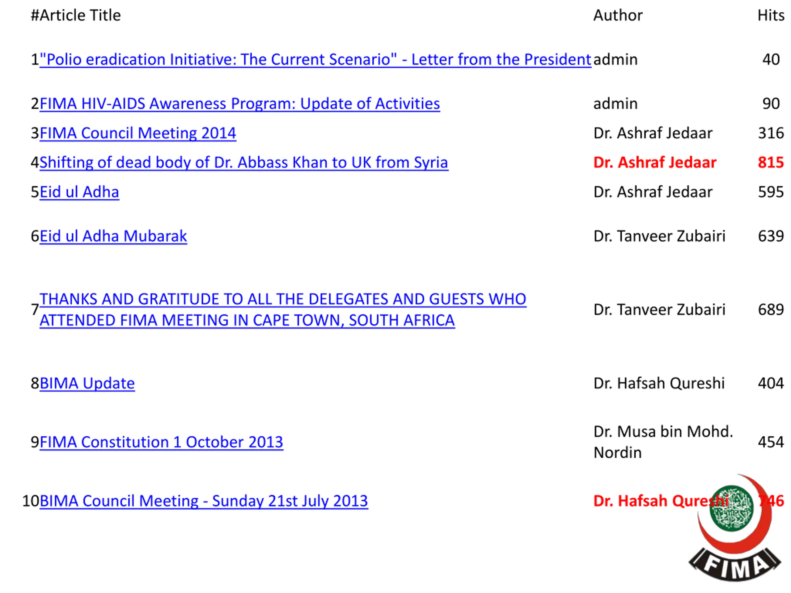# Article Title Author Hits 1 "Polio eradication Initiative: The Current Scenario" - Letter from the Presidentadmin 40 2 FIMA HIV-AIDS Awareness Program: Update of Activities admin 90 3 FIMA Council Meeting 2014 Dr. Ashraf Jedaar 316 4 Shifting of dead body of Dr. Abbass Khan to UK from Syria Dr. Ashraf Jedaar 815 5 Eid ul Adha Dr. Ashraf Jedaar 595 6 Eid ul Adha Mubarak Dr. Tanveer Zubairi 639 7 THANKS AND GRATITUDE TO ALL THE DELEGATES AND GUESTS WHO ATTENDED FIMA MEETING IN CAPE TOWN, SOUTH AFRICA Dr. Tanveer Zubairi 689 8 BIMA Update Dr. Hafsah Qureshi 404 Dr. Musa bin Mohd. Nordin 9 FIMA Constitution 1 October 2013 454 10 BIMA Council Meeting - Sunday 21st July 2013 Dr. Hafsah Qureshi 746