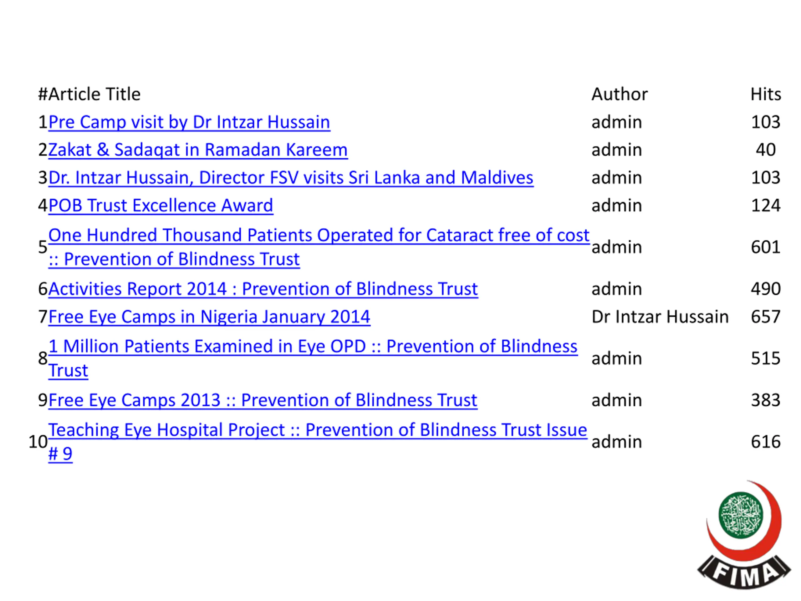 # Article Title 1 Pre Camp visit by Dr Intzar Hussain 2 Zakat & Sadaqat in Ramadan Kareem 3 Dr. Intzar Hussain, Director FSV visits Sri Lanka and Maldives 4 POB Trust Excellence Award 5 One Hundred Thousand Patients Operated for Cataract free of cost :: Prevention of Blindness Trust 6 Activities Report 2014 : Prevention of Blindness Trust 7 Free Eye Camps in Nigeria January 2014 8 1 Million Patients Examined in Eye OPD :: Prevention of Blindness Trust 9 Free Eye Camps 2013 :: Prevention of Blindness Trust 10 Teaching Eye Hospital Project :: Prevention of Blindness Trust Issue # 9 Author admin admin admin admin Hits 103 40 103 124 admin 601 admin Dr Intzar Hussain 657 490 admin 515 admin 383 admin 616