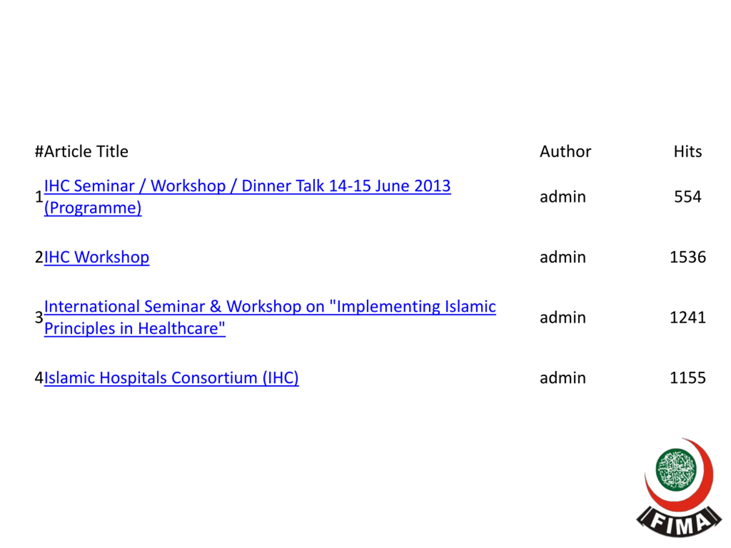 # Article Title Author Hits 1 IHC Seminar / Workshop / Dinner Talk 14-15 June 2013 (Programme) admin 554 2 IHC Workshop admin 1536 3 International Seminar & Workshop on "Implementing Islamic Principles in Healthcare" admin 1241 4 Islamic Hospitals Consortium (IHC) admin 1155
