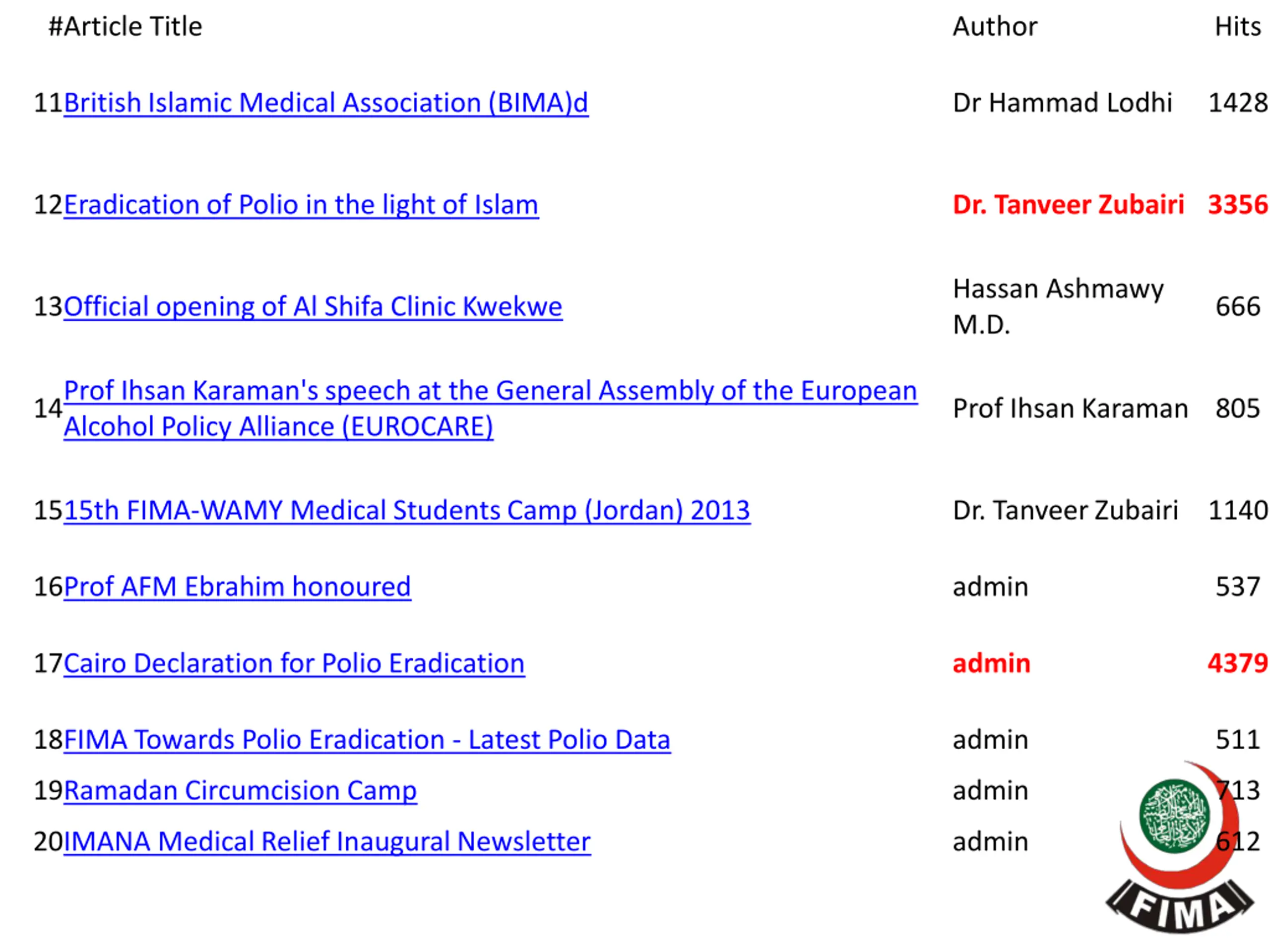 # Article Title Author Hits 11 British Islamic Medical Association (BIMA)d Dr Hammad Lodhi 1428 12 Eradication of Polio in the light of Islam Dr. Tanveer Zubairi 3356 Hassan Ashmawy M.D. 13 Official opening of Al Shifa Clinic Kwekwe 666 14 Prof Ihsan Karaman's speech at the General Assembly of the European Alcohol Policy Alliance (EUROCARE) Prof Ihsan Karaman 805 15 15th FIMA-WAMY Medical Students Camp (Jordan) 2013 Dr. Tanveer Zubairi 1140 16 Prof AFM Ebrahim honoured admin 537 17 Cairo Declaration for Polio Eradication admin 4379 18 FIMA Towards Polio Eradication - Latest Polio Data admin 511 19 Ramadan Circumcision Camp admin 713 20 IMANA Medical Relief Inaugural Newsletter admin 612