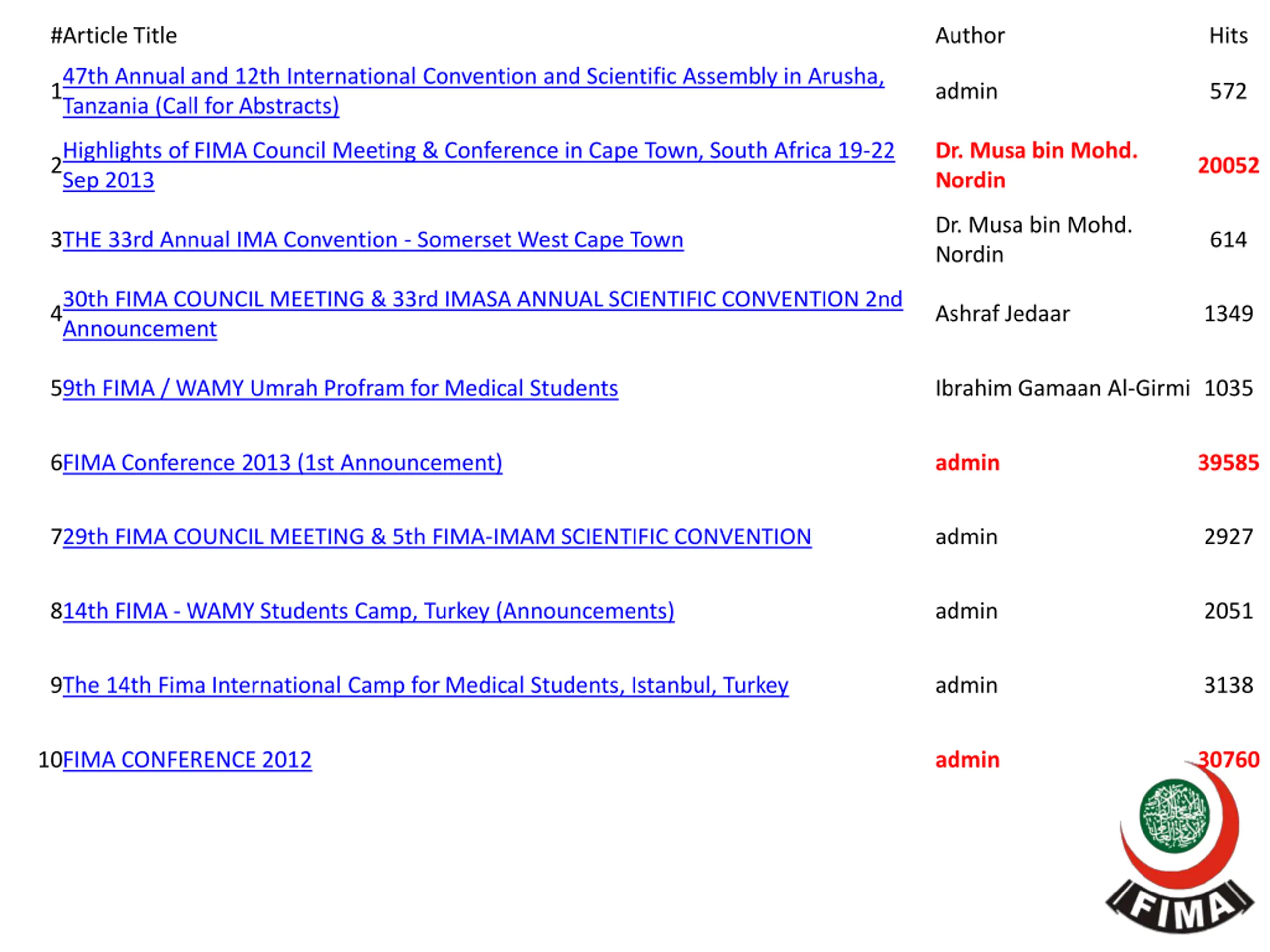 # Article Title Author Hits 1 47th Annual and 12th International Convention and Scientific Assembly in Arusha, Tanzania (Call for Abstracts) admin 572 2 Highlights of FIMA Council Meeting & Conference in Cape Town, South Africa 19-22 Sep 2013 Dr. Musa bin Mohd. Nordin 20052 Dr. Musa bin Mohd. Nordin 3 THE 33rd Annual IMA Convention - Somerset West Cape Town 614 4 30th FIMA COUNCIL MEETING & 33rd IMASA ANNUAL SCIENTIFIC CONVENTION 2nd Announcement Ashraf Jedaar 1349 5 9th FIMA / WAMY Umrah Profram for Medical Students Ibrahim Gamaan Al-Girmi 1035 6 FIMA Conference 2013 (1st Announcement) admin 39585 7 29th FIMA COUNCIL MEETING & 5th FIMA-IMAM SCIENTIFIC CONVENTION admin 2927 8 14th FIMA - WAMY Students Camp, Turkey (Announcements) admin 2051 9 The 14th Fima International Camp for Medical Students, Istanbul, Turkey admin 3138 10 FIMA CONFERENCE 2012 admin 30760