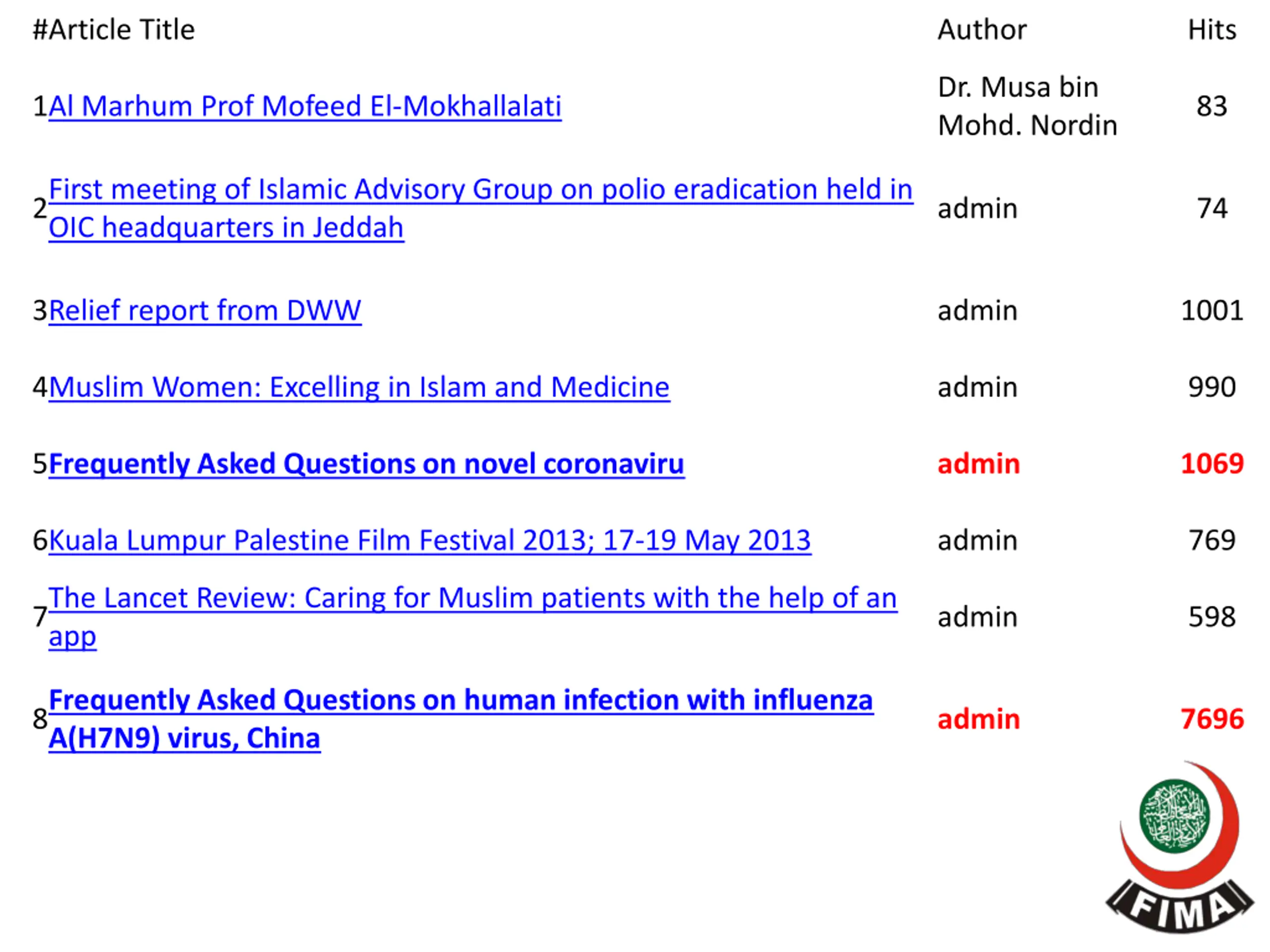 # Article Title Author Hits Dr. Musa bin Mohd. Nordin 1 Al Marhum Prof Mofeed El-Mokhallalati 83 2 First meeting of Islamic Advisory Group on polio eradication held in OIC headquarters in Jeddah admin 74 3 Relief report from DWW admin 1001 4 Muslim Women: Excelling in Islam and Medicine admin 990 5 Frequently Asked Questions on novel coronaviru admin 1069 6 Kuala Lumpur Palestine Film Festival 2013; 17-19 May 2013 admin 769 7 The Lancet Review: Caring for Muslim patients with the help of an app admin 598 8 Frequently Asked Questions on human infection with influenza A(H7N9) virus, China admin 7696