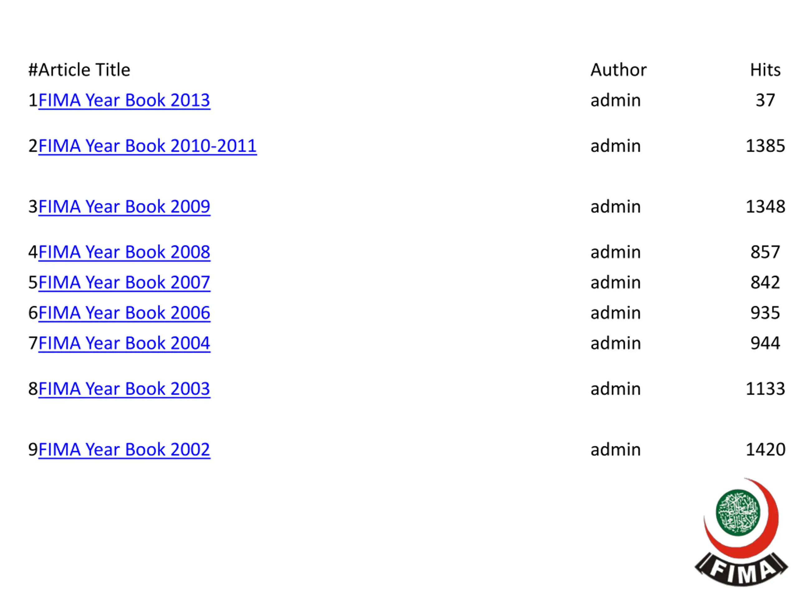 # Article Title Author Hits 1 FIMA Year Book 2013 admin 37 2 FIMA Year Book 2010-2011 admin 1385 3 FIMA Year Book 2009 admin 1348 4 FIMA Year Book 2008 admin 857 5 FIMA Year Book 2007 admin 842 6 FIMA Year Book 2006 admin 935 7 FIMA Year Book 2004 admin 944 8 FIMA Year Book 2003 admin 1133 9 FIMA Year Book 2002 admin 1420
