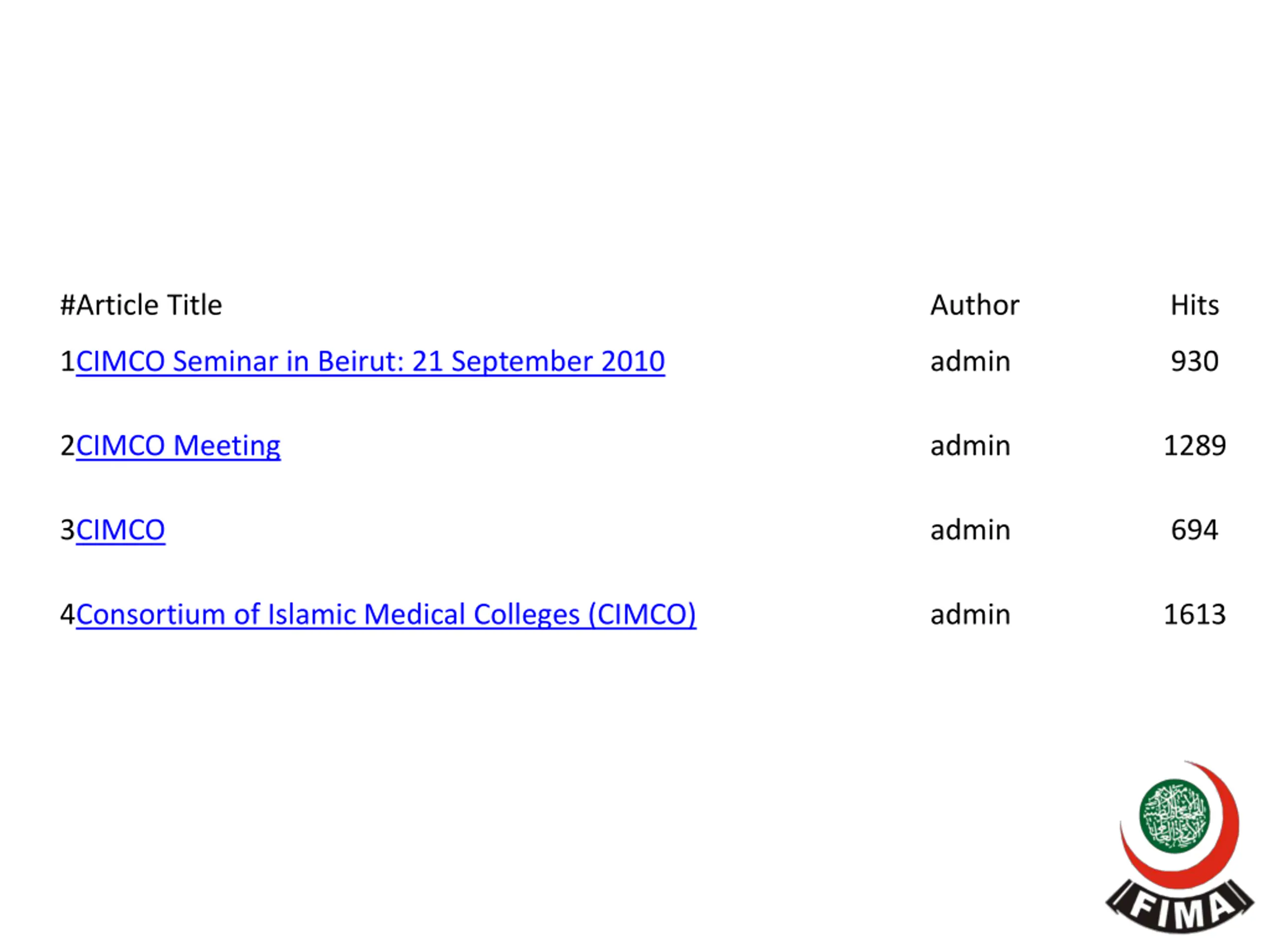 # Article Title Author Hits 1 CIMCO Seminar in Beirut: 21 September 2010 admin 930 2 CIMCO Meeting admin 1289 3 CIMCO admin 694 4 Consortium of Islamic Medical Colleges (CIMCO) admin 1613