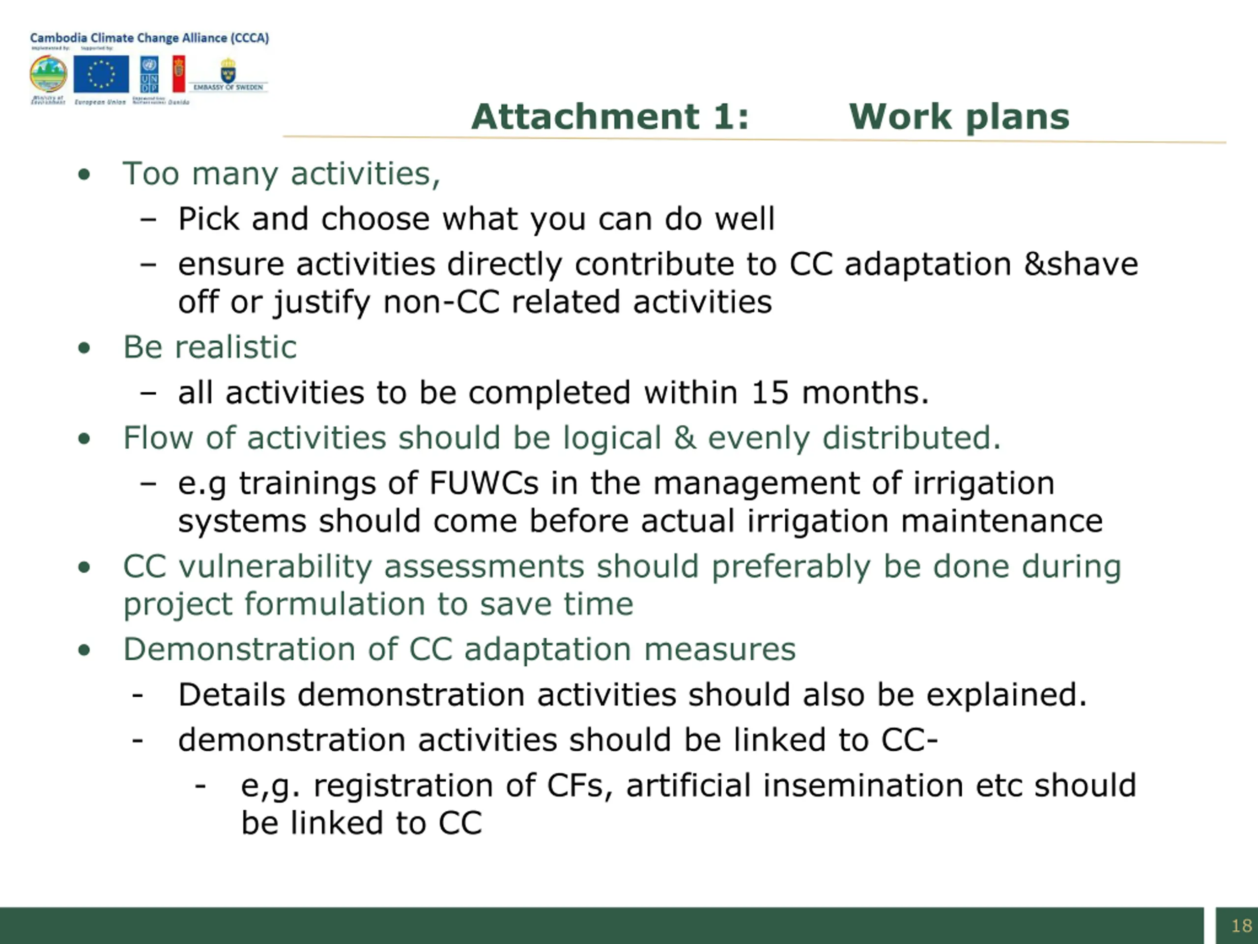 Attachment 1: Work plans Too many activities, Pick and choose what you can do well ensure activities directly contribute to CC adaptation &shave off or justify non-CC related activities Be realistic all activities to be completed within 15 months. Flow of activities should be logical & evenly distributed. e.g trainings of FUWCs in the management of irrigation systems should come before actual irrigation maintenance CC vulnerability assessments should preferably be done during project formulation to save time Demonstration of CC adaptation measures - Details demonstration activities should also be explained. - demonstration activities should be linked to CC- - e,g. registration of CFs, artificial insemination etc should be linked to CC 18