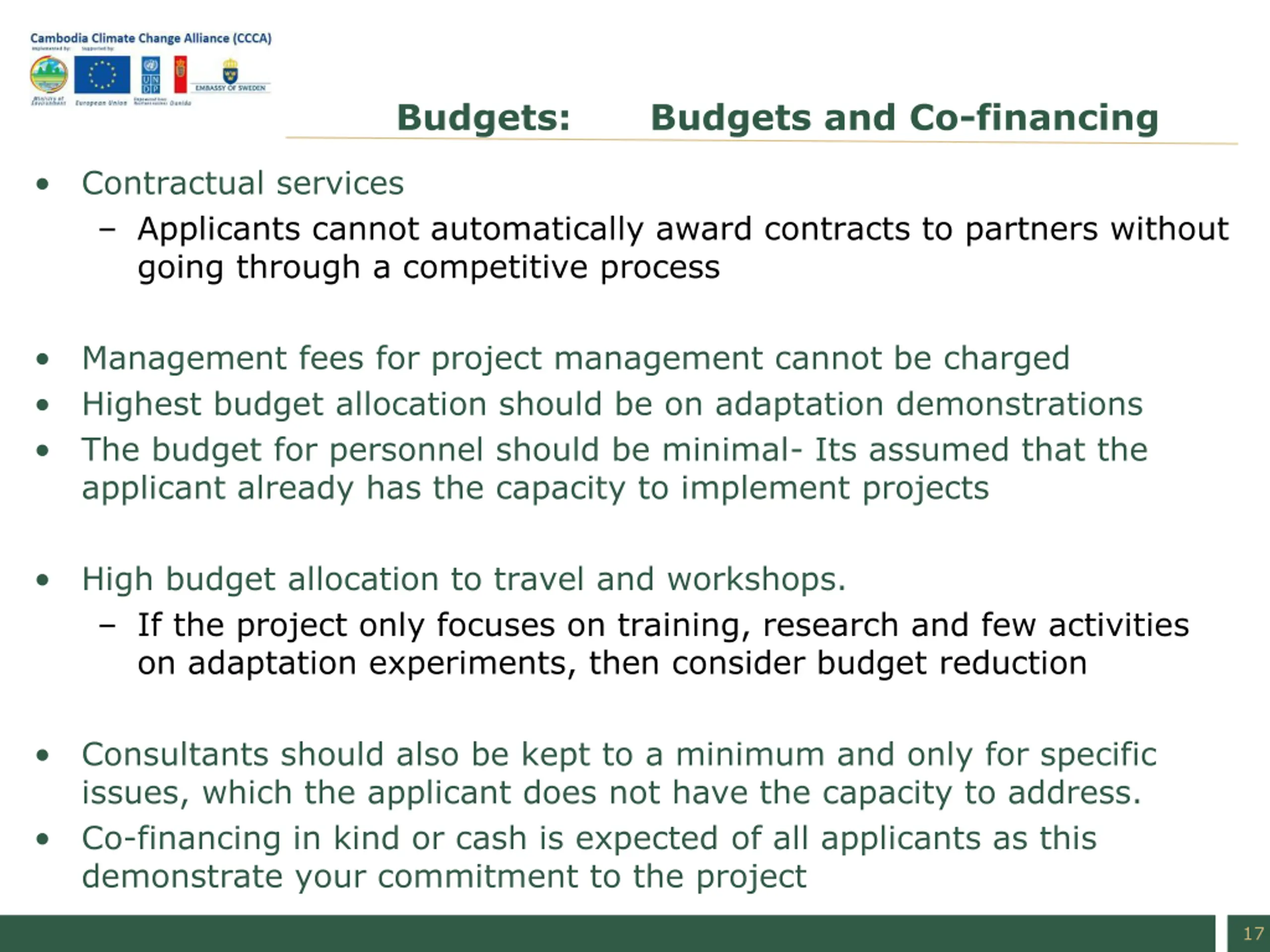 Budgets: Budgets and Co-financing Contractual services Applicants cannot automatically award contracts to partners without going through a competitive process Management fees for project management cannot be charged Highest budget allocation should be on adaptation demonstrations The budget for personnel should be minimal- Its assumed that the applicant already has the capacity to implement projects High budget allocation to travel and workshops. If the project only focuses on training, research and few activities on adaptation experiments, then consider budget reduction Consultants should also be kept to a minimum and only for specific issues, which the applicant does not have the capacity to address. Co-financing in kind or cash is expected of all applicants as this demonstrate your commitment to the project 17