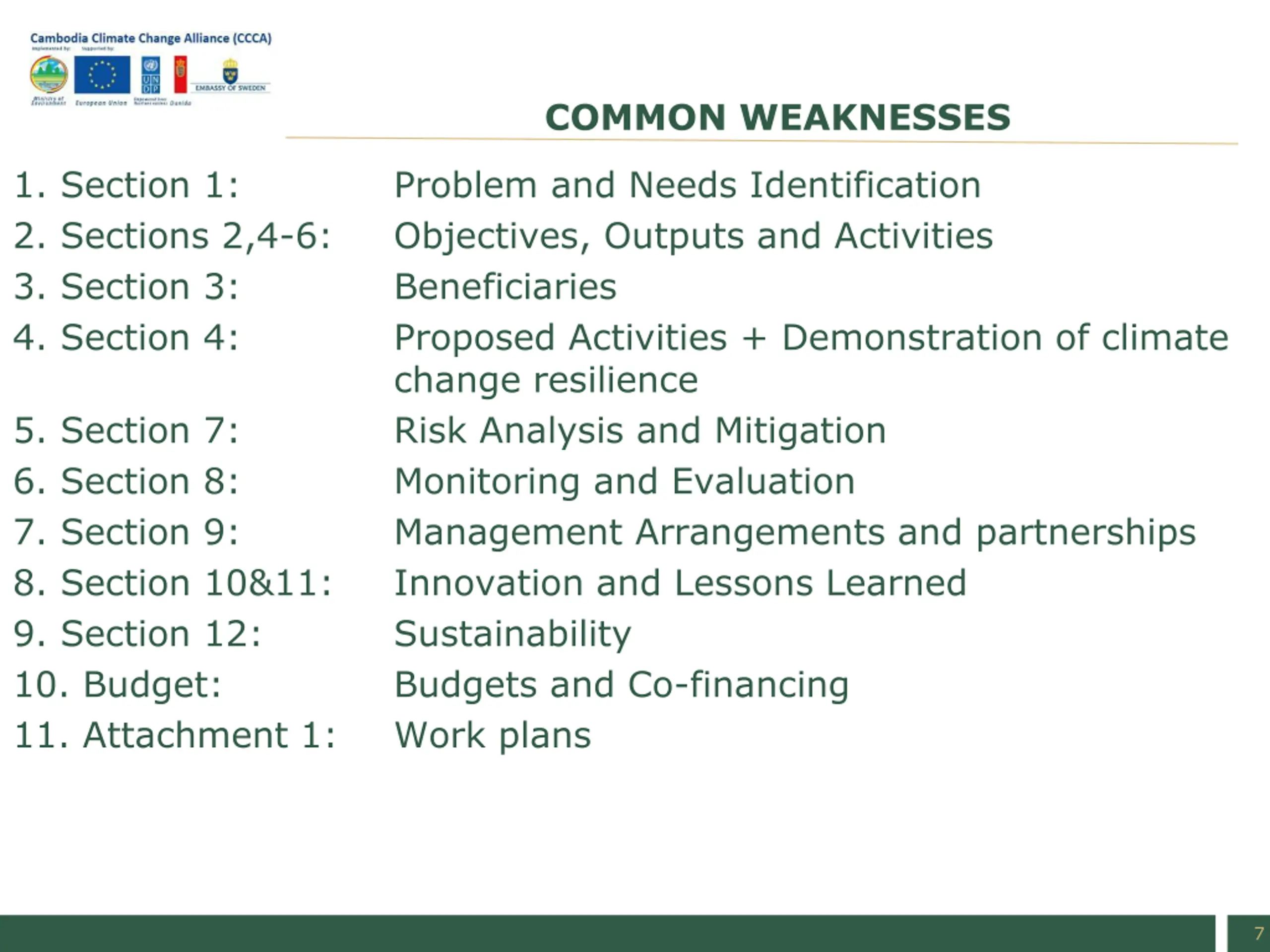 COMMON WEAKNESSES 1. Section 1: 2. Sections 2,4-6: 3. Section 3: 4. Section 4: Problem and Needs Identification Objectives, Outputs and Activities Beneficiaries Proposed Activities + Demonstration of climate change resilience Risk Analysis and Mitigation Monitoring and Evaluation Management Arrangements and partnerships Innovation and Lessons Learned Sustainability Budgets and Co-financing Work plans 5. Section 7: 6. Section 8: 7. Section 9: 8. Section 10&11: 9. Section 12: 10. Budget: 11. Attachment 1: 7