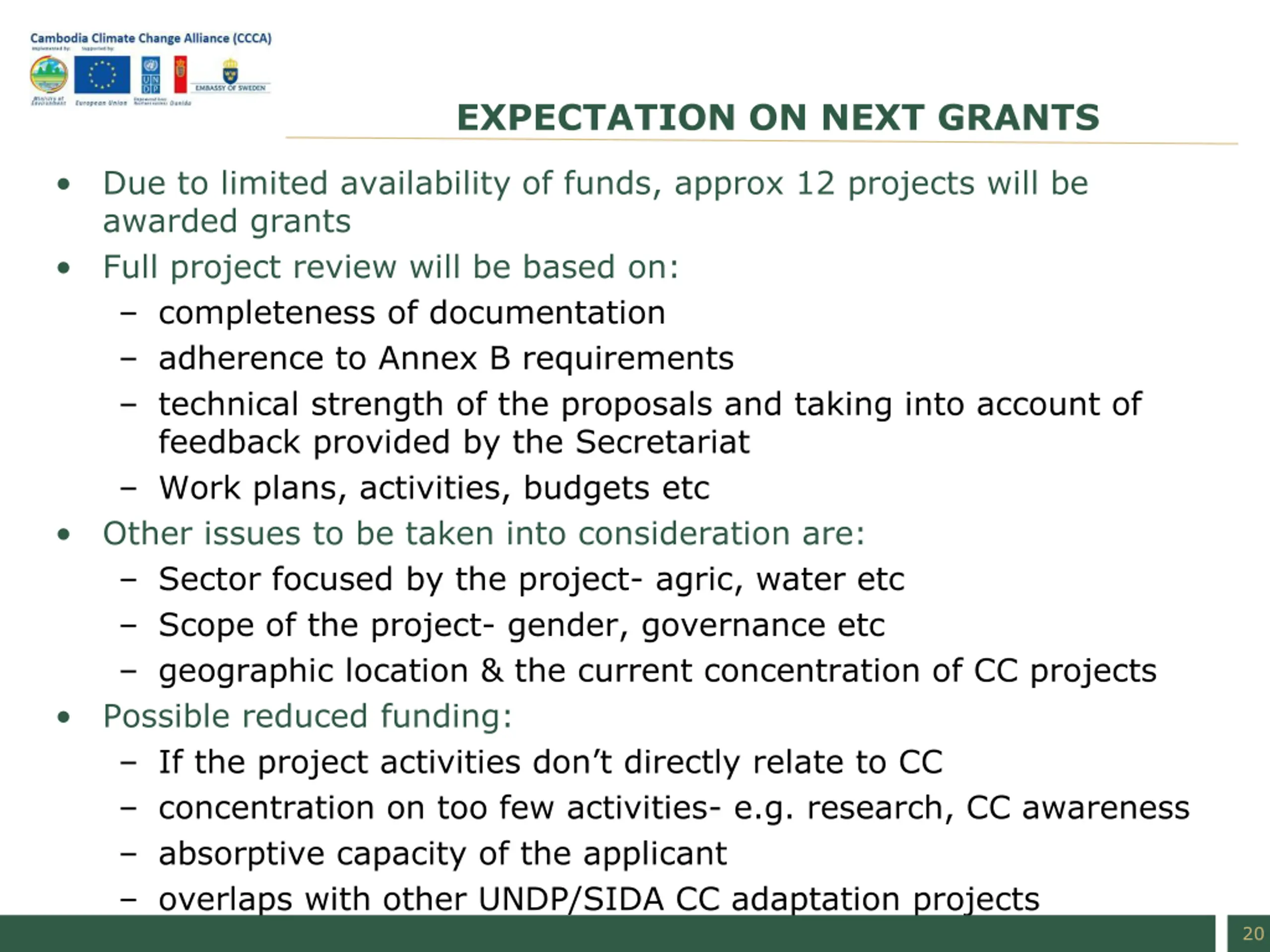 EXPECTATION ON NEXT GRANTS Due to limited availability of funds, approx 12 projects will be awarded grants Full project review will be based on: completeness of documentation adherence to Annex B requirements technical strength of the proposals and taking into account of feedback provided by the Secretariat Work plans, activities, budgets etc Other issues to be taken into consideration are: Sector focused by the project- agric, water etc Scope of the project- gender, governance etc geographic location & the current concentration of CC projects Possible reduced funding: If the project activities don t directly relate to CC concentration on too few activities- e.g. research, CC awareness absorptive capacity of the applicant overlaps with other UNDP/SIDA CC adaptation projects 20