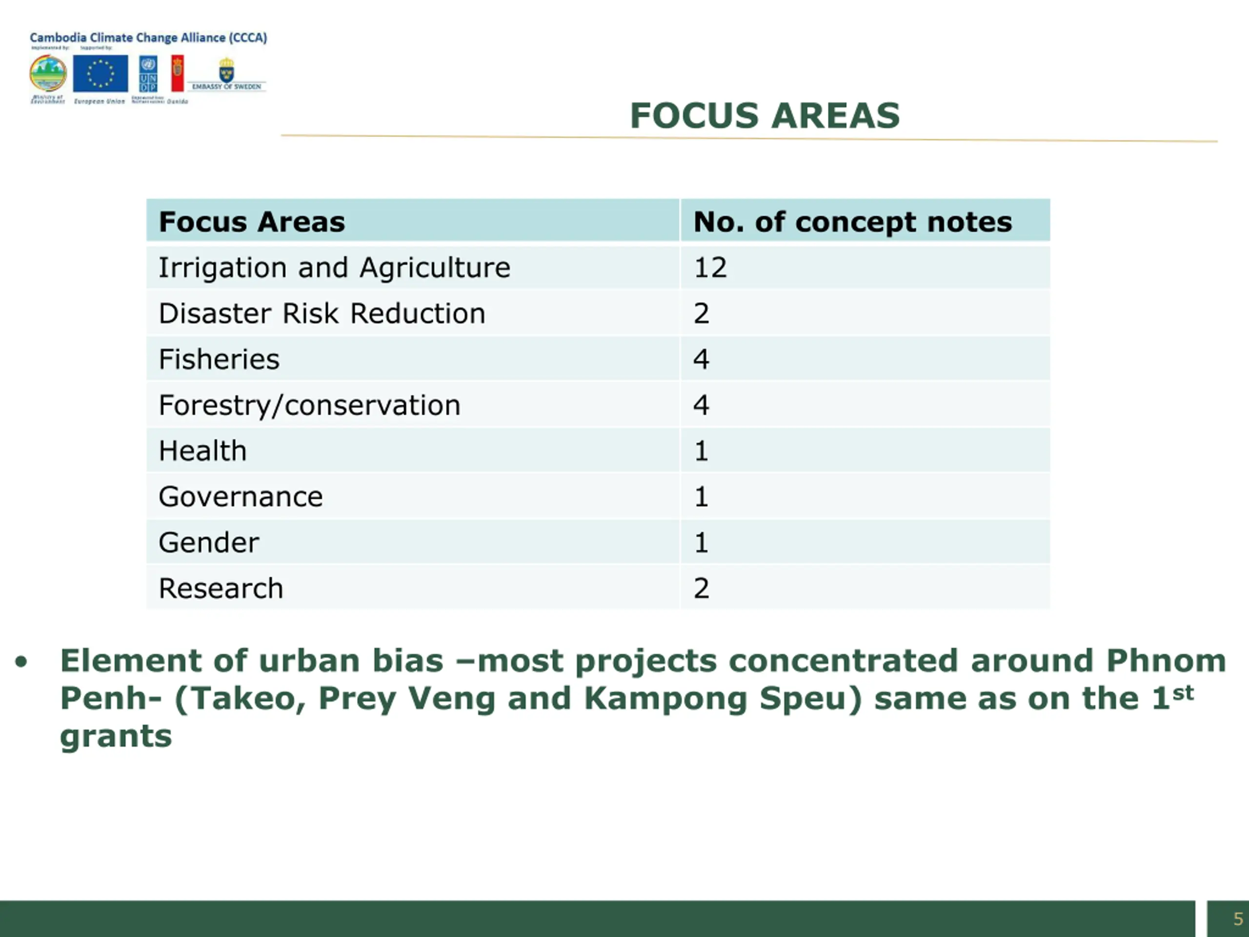 FOCUS AREAS Focus Areas Irrigation and Agriculture Disaster Risk Reduction Fisheries Forestry/conservation Health Governance Gender Research No. of concept notes 12 2 4 4 1 1 1 2 Element of urban bias most projects concentrated around Phnom Penh- (Takeo, Prey Veng and Kampong Speu) same as on the 1st grants 5