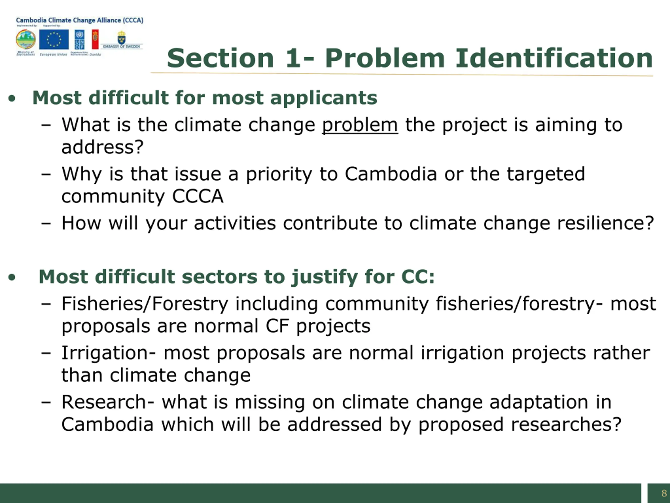 Section 1- Problem Identification Most difficult for most applicants What is the climate change problem the project is aiming to address? Why is that issue a priority to Cambodia or the targeted community CCCA How will your activities contribute to climate change resilience? Most difficult sectors to justify for CC: Fisheries/Forestry including community fisheries/forestry- most proposals are normal CF projects Irrigation- most proposals are normal irrigation projects rather than climate change Research- what is missing on climate change adaptation in Cambodia which will be addressed by proposed researches? 8