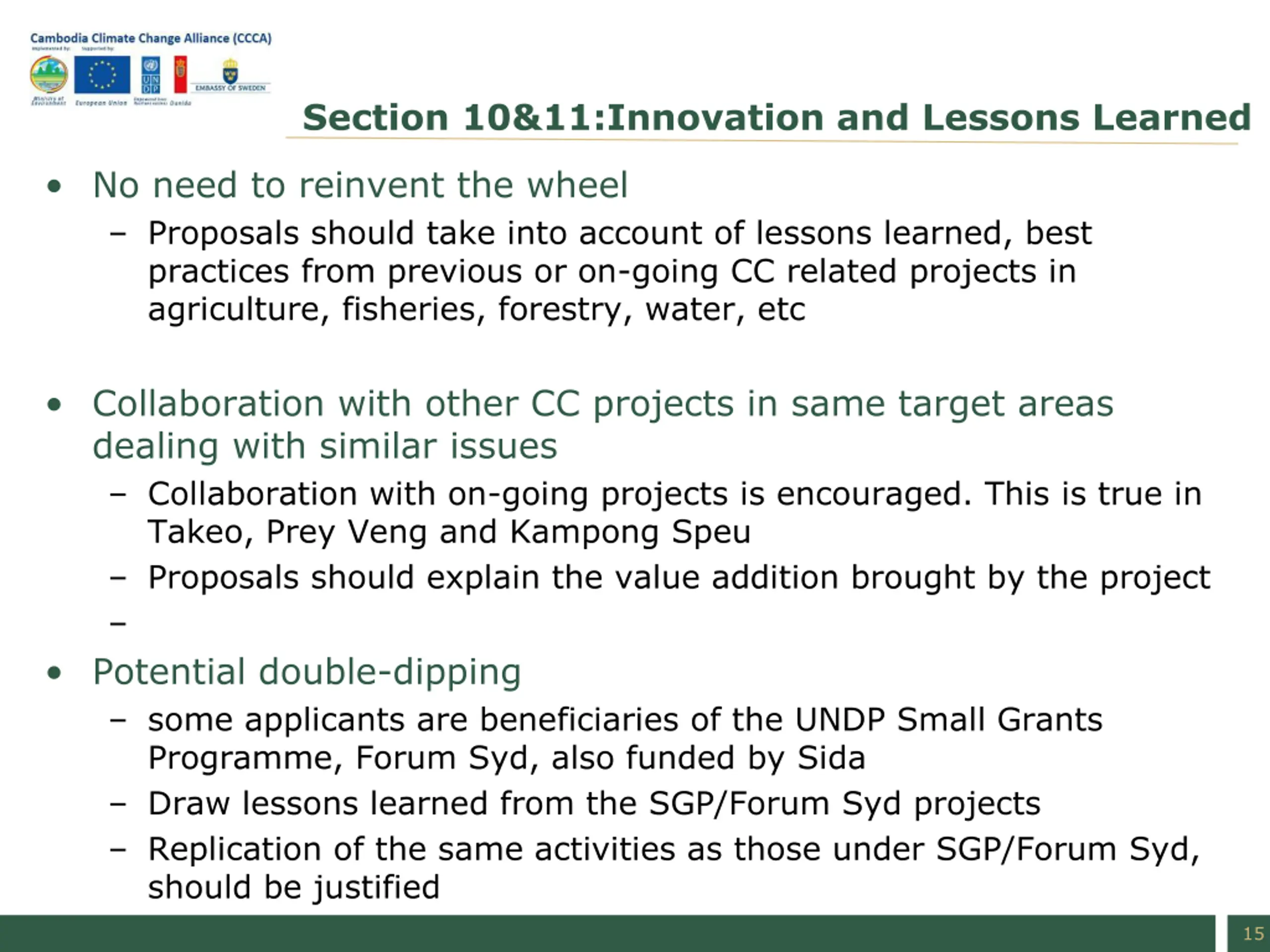 Section 10&11:Innovation and Lessons Learned No need to reinvent the wheel Proposals should take into account of lessons learned, best practices from previous or on-going CC related projects in agriculture, fisheries, forestry, water, etc Collaboration with other CC projects in same target areas dealing with similar issues Collaboration with on-going projects is encouraged. This is true in Takeo, Prey Veng and Kampong Speu Proposals should explain the value addition brought by the project Potential double-dipping some applicants are beneficiaries of the UNDP Small Grants Programme, Forum Syd, also funded by Sida Draw lessons learned from the SGP/Forum Syd projects Replication of the same activities as those under SGP/Forum Syd, should be justified 15