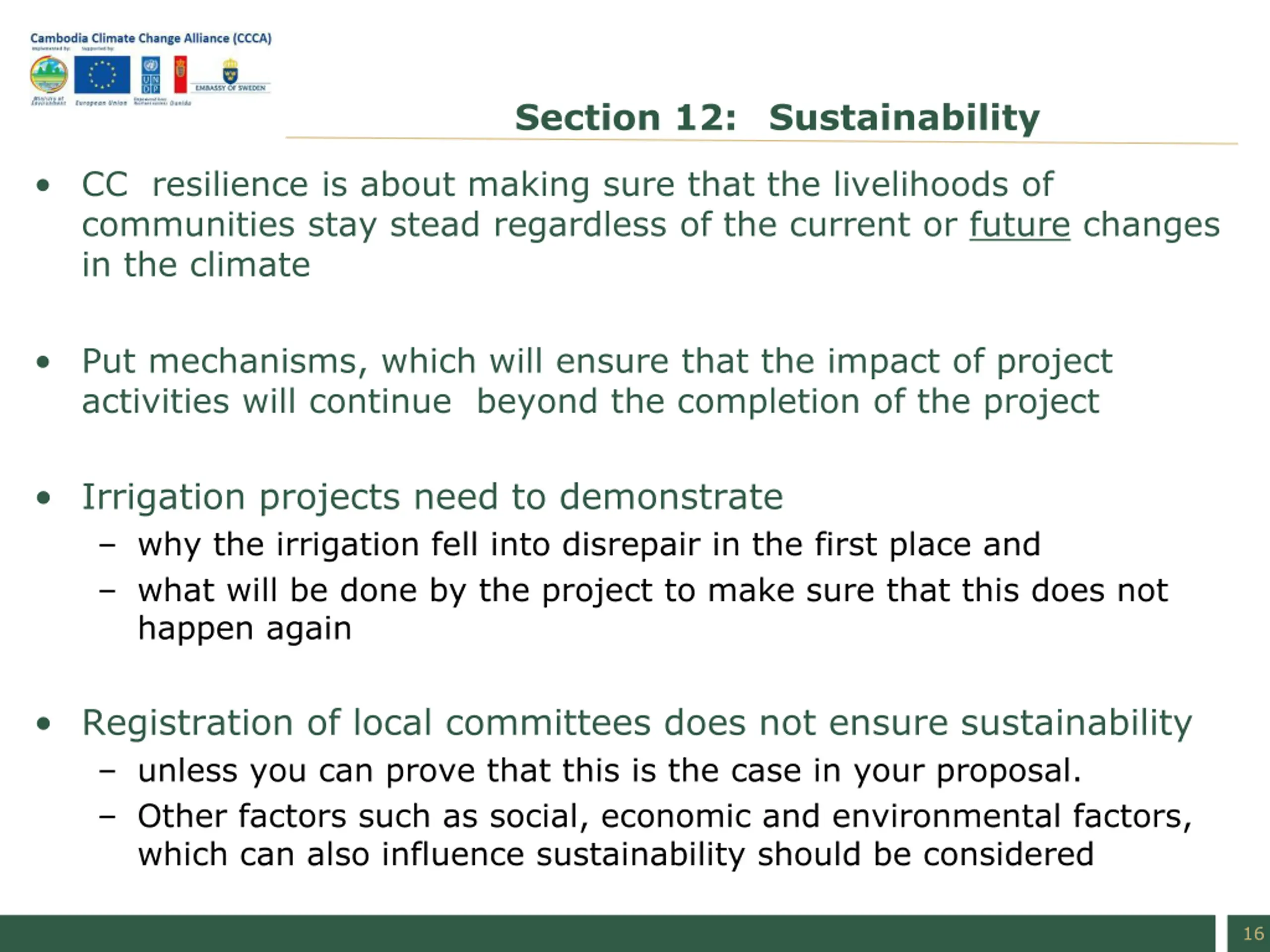 Section 12: Sustainability CC resilience is about making sure that the livelihoods of communities stay stead regardless of the current or future changes in the climate Put mechanisms, which will ensure that the impact of project activities will continue beyond the completion of the project Irrigation projects need to demonstrate why the irrigation fell into disrepair in the first place and what will be done by the project to make sure that this does not happen again Registration of local committees does not ensure sustainability unless you can prove that this is the case in your proposal. Other factors such as social, economic and environmental factors, which can also influence sustainability should be considered 16