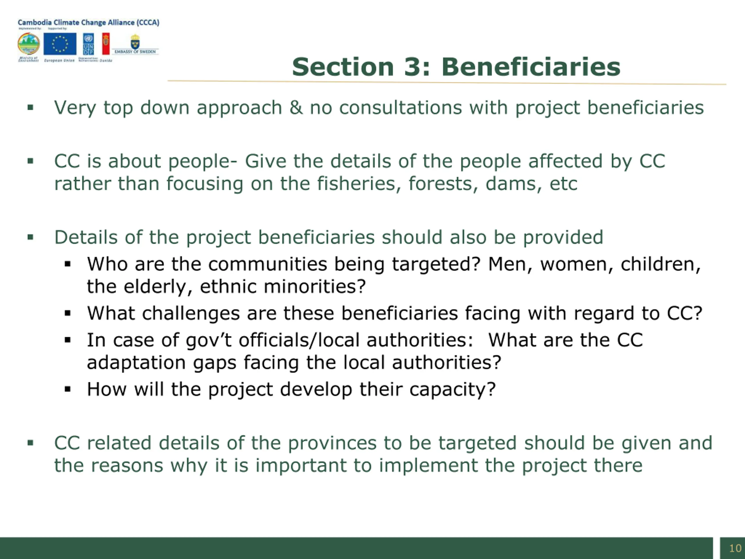 Section 3: Beneficiaries Very top down approach & no consultations with project beneficiaries CC is about people- Give the details of the people affected by CC rather than focusing on the fisheries, forests, dams, etc Details of the project beneficiaries should also be provided Who are the communities being targeted? Men, women, children, the elderly, ethnic minorities? What challenges are these beneficiaries facing with regard to CC? In case of gov t officials/local authorities: What are the CC adaptation gaps facing the local authorities? How will the project develop their capacity? CC related details of the provinces to be targeted should be given and the reasons why it is important to implement the project there 10