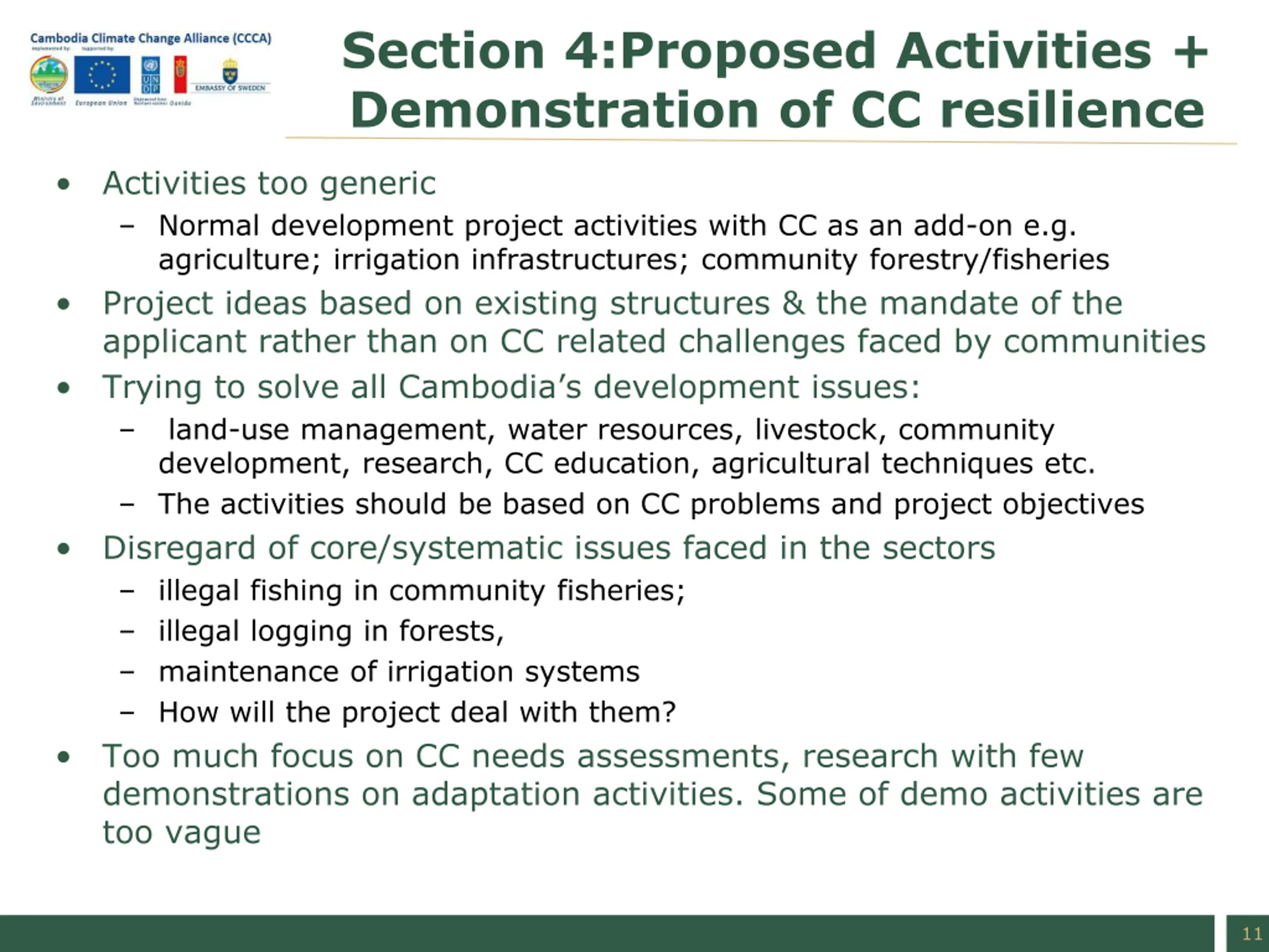 Section 4:Proposed Activities + Demonstration of CC resilience Activities too generic Normal development project activities with CC as an add-on e.g. agriculture; irrigation infrastructures; community forestry/fisheries Project ideas based on existing structures & the mandate of the applicant rather than on CC related challenges faced by communities Trying to solve all Cambodia s development issues: land-use management, water resources, livestock, community development, research, CC education, agricultural techniques etc. The activities should be based on CC problems and project objectives Disregard of core/systematic issues faced in the sectors illegal fishing in community fisheries; illegal logging in forests, maintenance of irrigation systems How will the project deal with them? Too much focus on CC needs assessments, research with few demonstrations on adaptation activities. Some of demo activities are too vague 11
