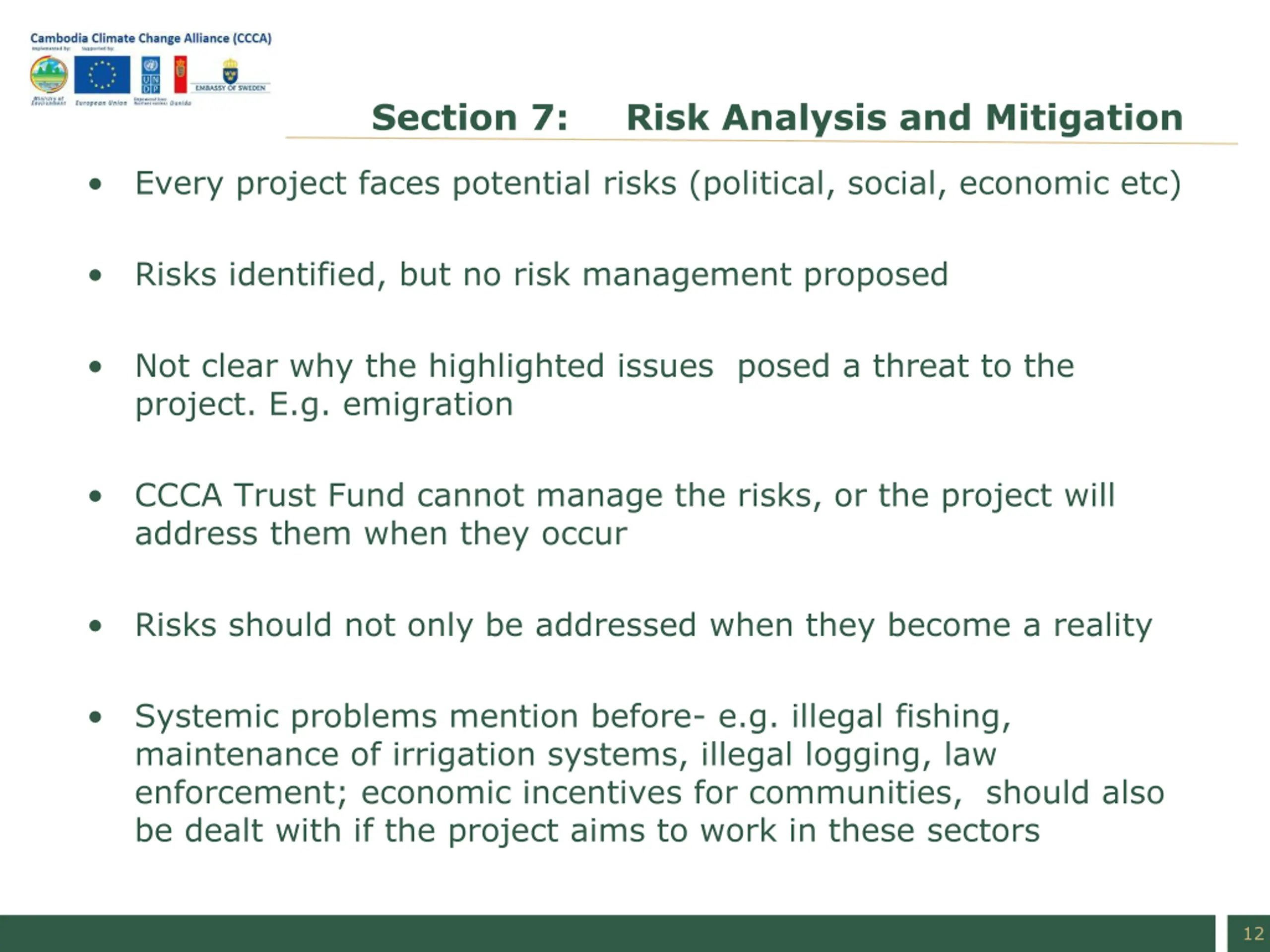 Section 7: Risk Analysis and Mitigation Every project faces potential risks (political, social, economic etc) Risks identified, but no risk management proposed Not clear why the highlighted issues posed a threat to the project. E.g. emigration CCCA Trust Fund cannot manage the risks, or the project will address them when they occur Risks should not only be addressed when they become a reality Systemic problems mention before- e.g. illegal fishing, maintenance of irrigation systems, illegal logging, law enforcement; economic incentives for communities, should also be dealt with if the project aims to work in these sectors 12