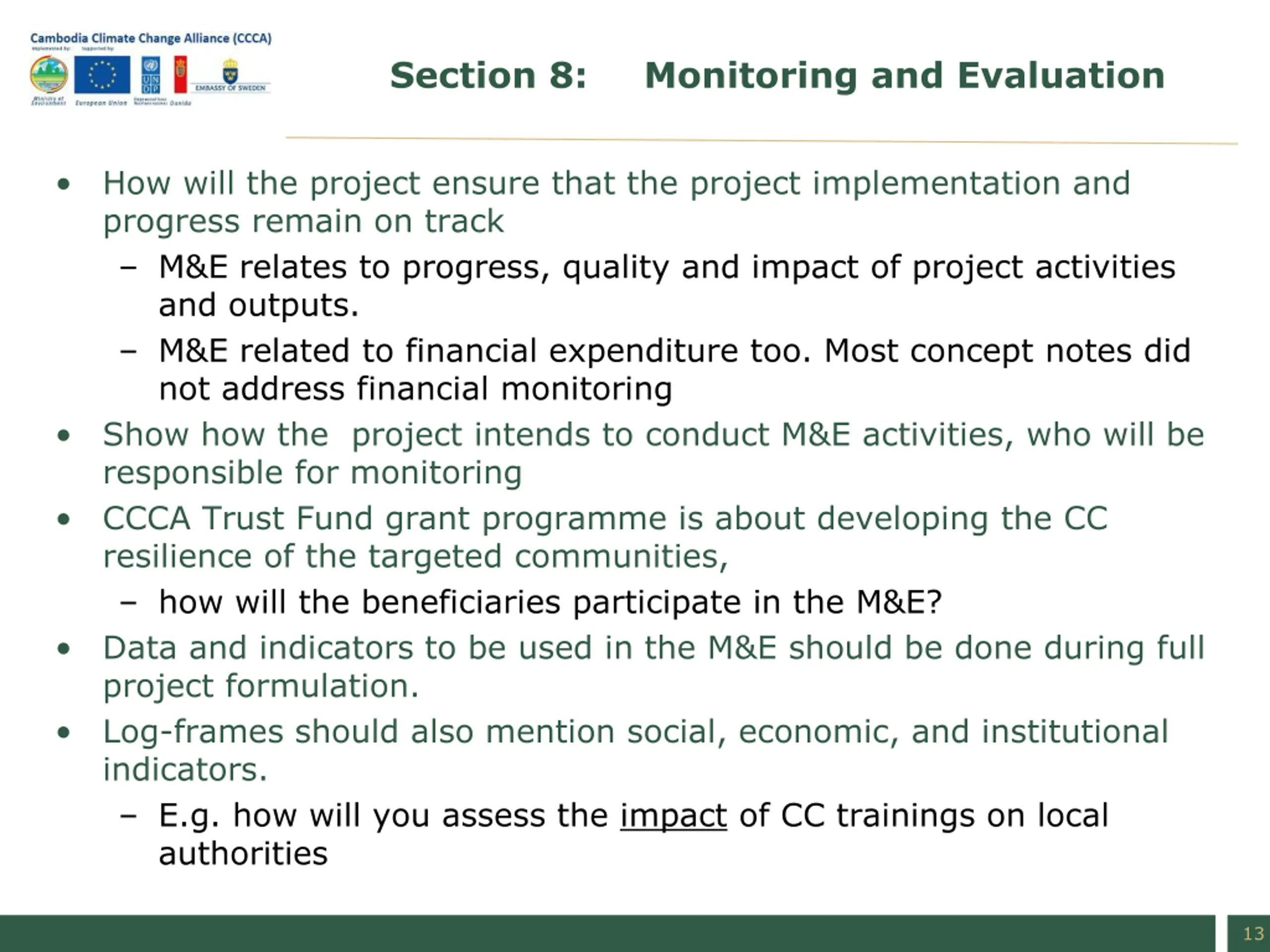 Section 8: Monitoring and Evaluation How will the project ensure that the project implementation and progress remain on track M&E relates to progress, quality and impact of project activities and outputs. M&E related to financial expenditure too. Most concept notes did not address financial monitoring Show how the project intends to conduct M&E activities, who will be responsible for monitoring CCCA Trust Fund grant programme is about developing the CC resilience of the targeted communities, how will the beneficiaries participate in the M&E? Data and indicators to be used in the M&E should be done during full project formulation. Log-frames should also mention social, economic, and institutional indicators. E.g. how will you assess the impact of CC trainings on local authorities 13