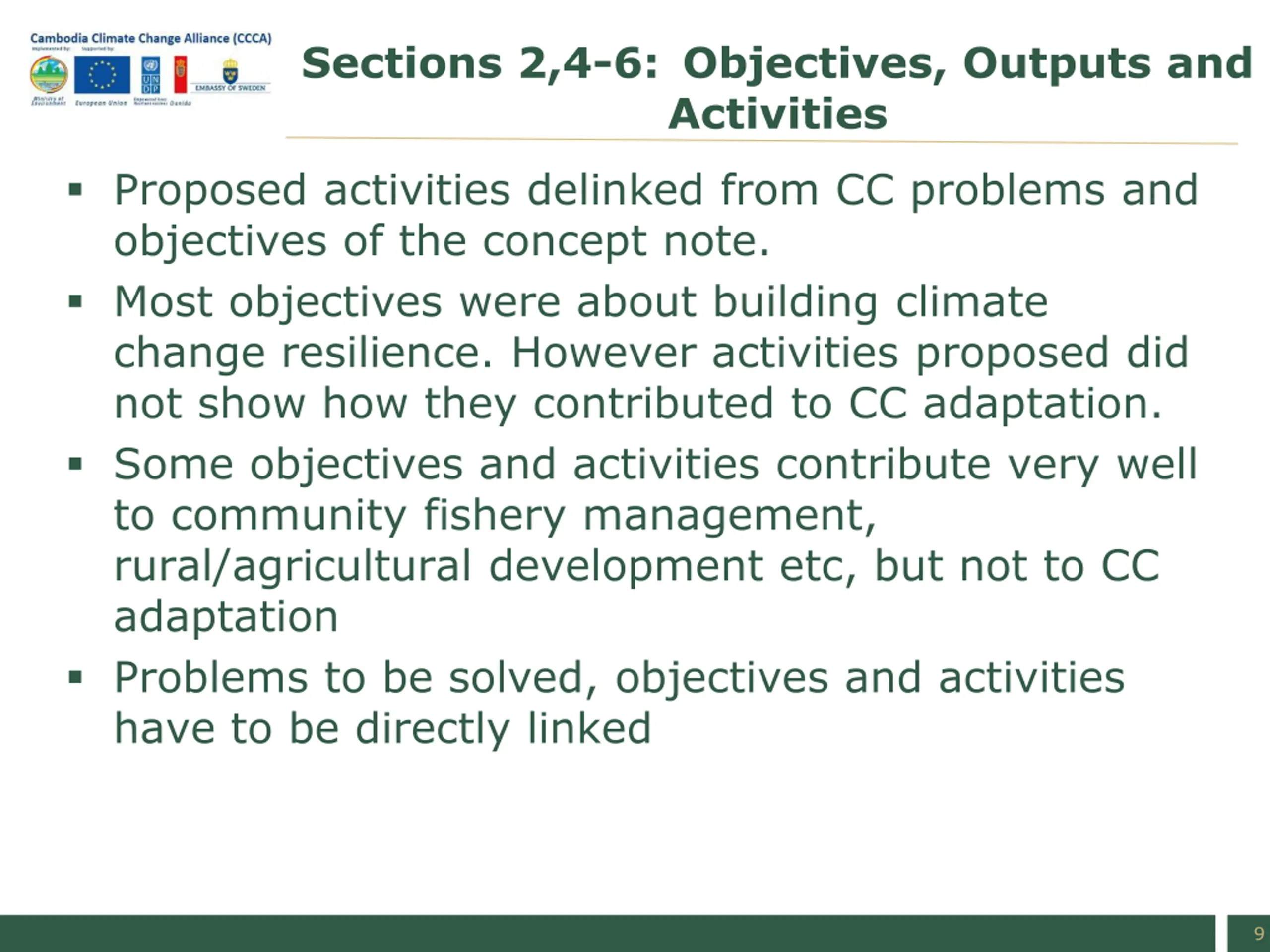 Sections 2,4-6: Objectives, Outputs and Activities Proposed activities delinked from CC problems and objectives of the concept note. Most objectives were about building climate change resilience. However activities proposed did not show how they contributed to CC adaptation. Some objectives and activities contribute very well to community fishery management, rural/agricultural development etc, but not to CC adaptation Problems to be solved, objectives and activities have to be directly linked 9