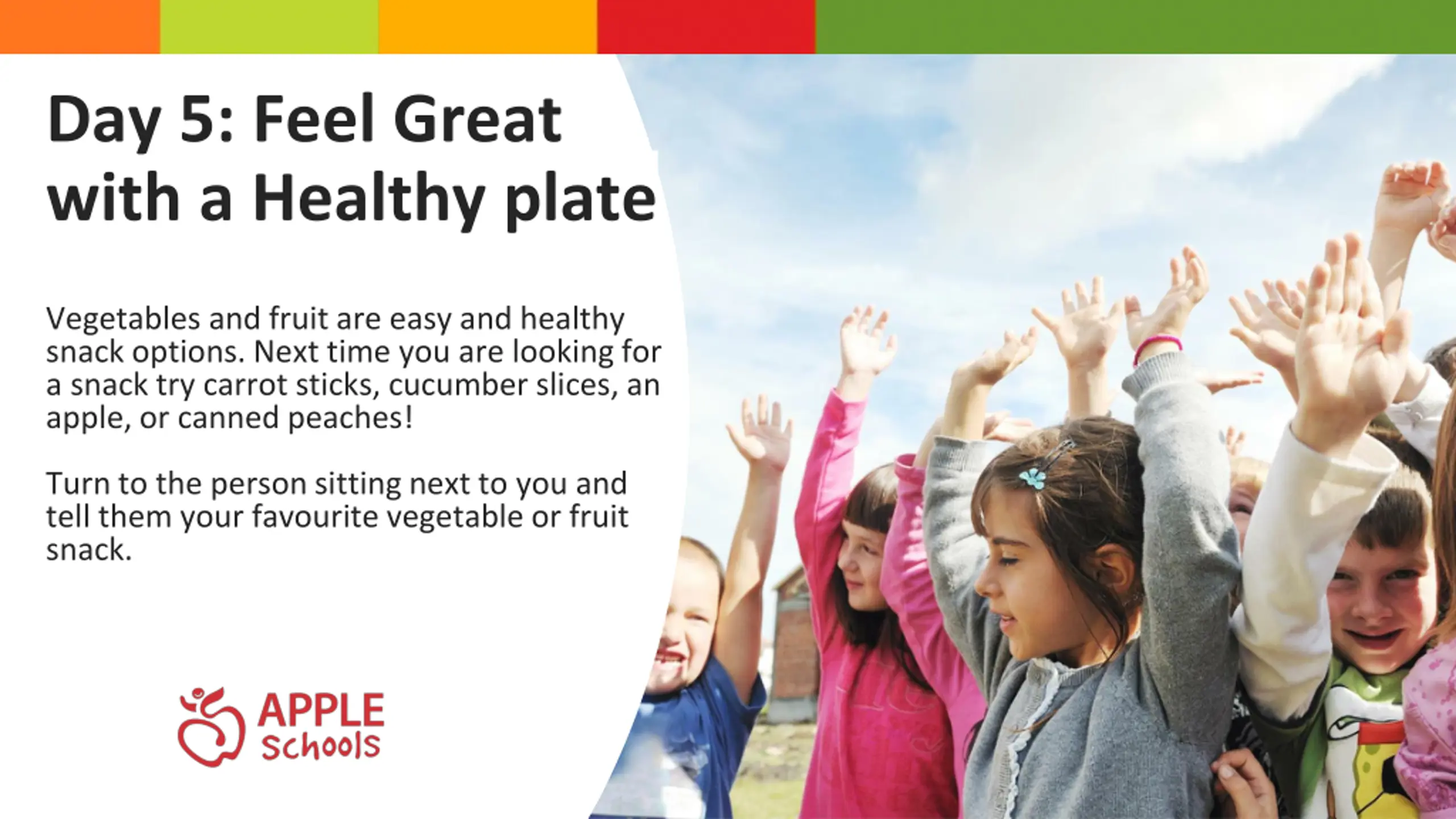Day 5: Feel Great with a Healthy plate Vegetables and fruit are easy and healthy snack options. Next time you are looking for a snack try carrot sticks, cucumber slices, an apple, or canned peaches! Turn to the person sitting next to you and tell them your favourite vegetable or fruit snack.