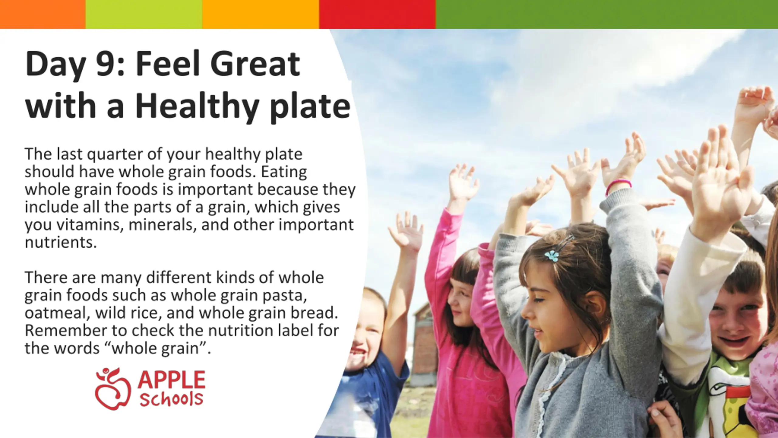 Day 9: Feel Great with a Healthy plate The last quarter of your healthy plate should have whole grain foods. Eating whole grain foods is important because they include all the parts of a grain, which gives you vitamins, minerals, and other important nutrients. There are many different kinds of whole grain foods such as whole grain pasta, oatmeal, wild rice, and whole grain bread. Remember to check the nutrition label for the words whole grain .