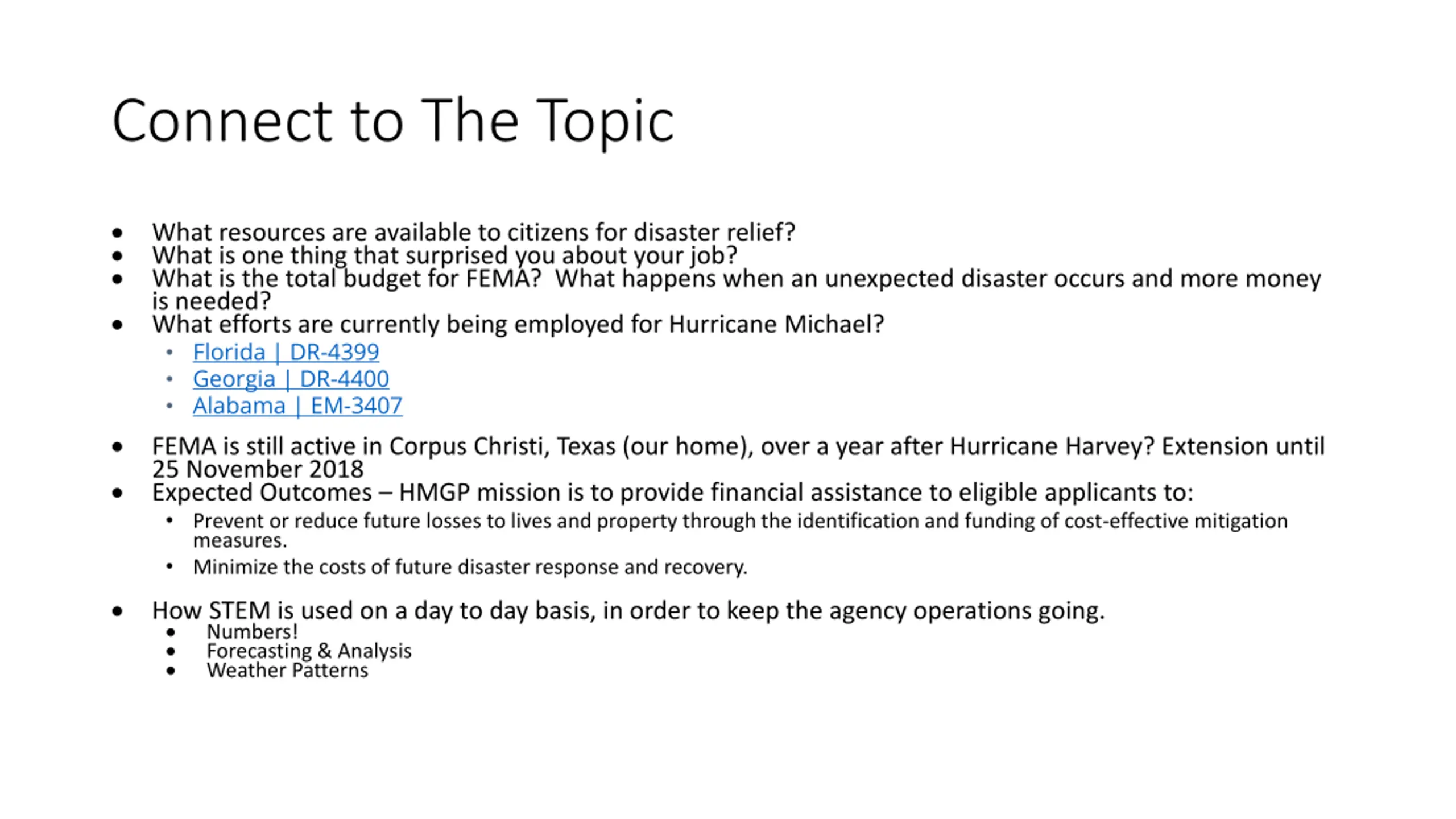 Connect to The Topic What resources are available to citizens for disaster relief? What is one thing that surprised you about your job? What is the total budget for FEMA? What happens when an unexpected disaster occurs and more money is needed? What efforts are currently being employed for Hurricane Michael? Florida | DR-4399 Georgia | DR-4400 Alabama | EM-3407 FEMA is still active in Corpus Christi, Texas (our home), over a year after Hurricane Harvey? Extension until 25 November 2018 Expected Outcomes HMGP mission is to provide financial assistance to eligible applicants to: Prevent or reduce future losses to lives and property through the identification and funding of cost-effective mitigation measures. Minimize the costs of future disaster response and recovery. How STEM is used on a day to day basis, in order to keep the agency operations going. Numbers! Forecasting & Analysis Weather Patterns