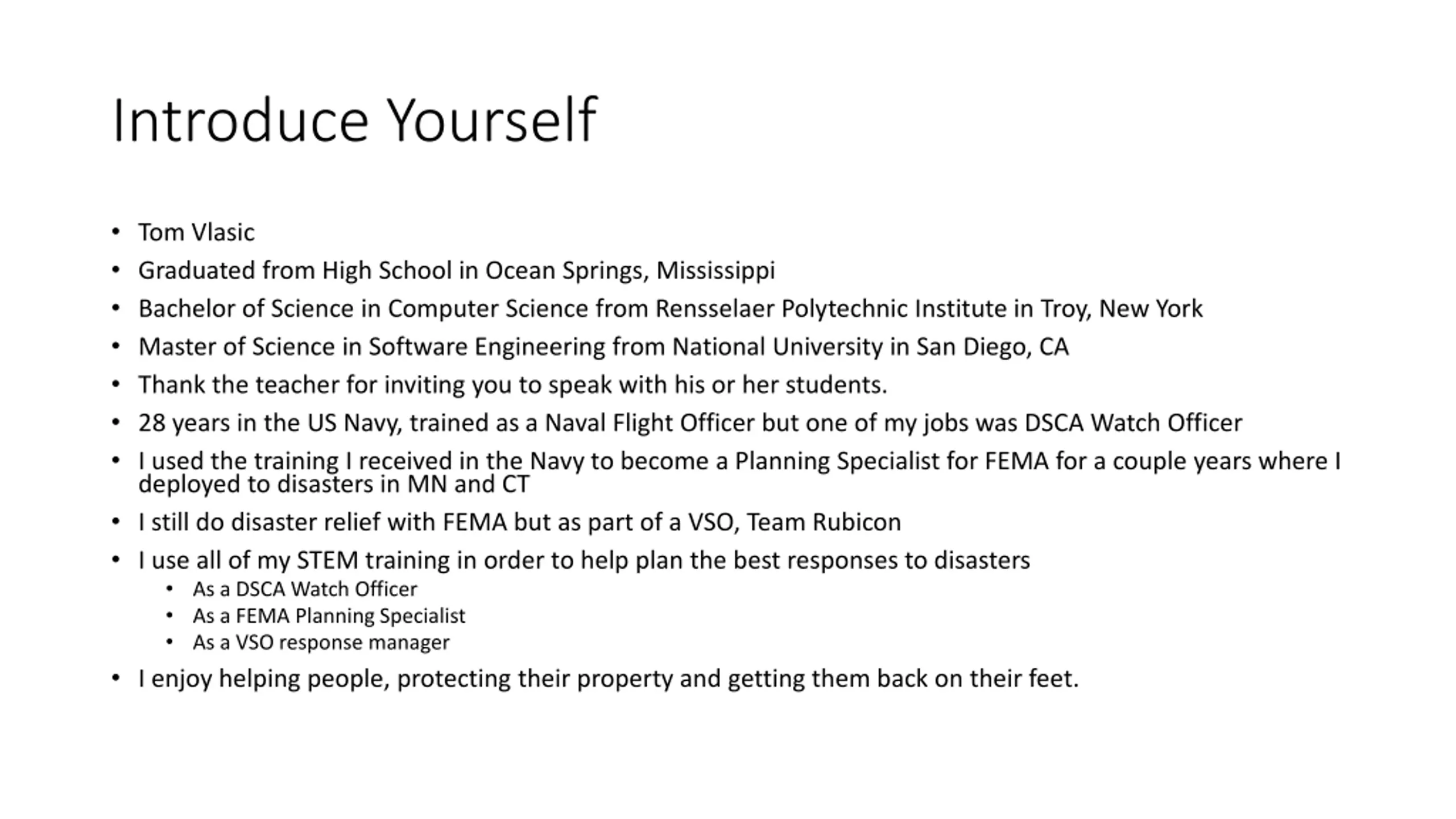 Introduce Yourself Tom Vlasic Graduated from High School in Ocean Springs, Mississippi Bachelor of Science in Computer Science from Rensselaer Polytechnic Institute in Troy, New York Master of Science in Software Engineering from National University in San Diego, CA Thank the teacher for inviting you to speak with his or her students. 28 years in the US Navy, trained as a Naval Flight Officer but one of my jobs was DSCA Watch Officer I used the training I received in the Navy to become a Planning Specialist for FEMA for a couple years where I deployed to disasters in MN and CT I still do disaster relief with FEMA but as part of a VSO, Team Rubicon I use all of my STEM training in order to help plan the best responses to disasters As a DSCA Watch Officer As a FEMA Planning Specialist As a VSO response manager I enjoy helping people, protecting their property and getting them back on their feet.