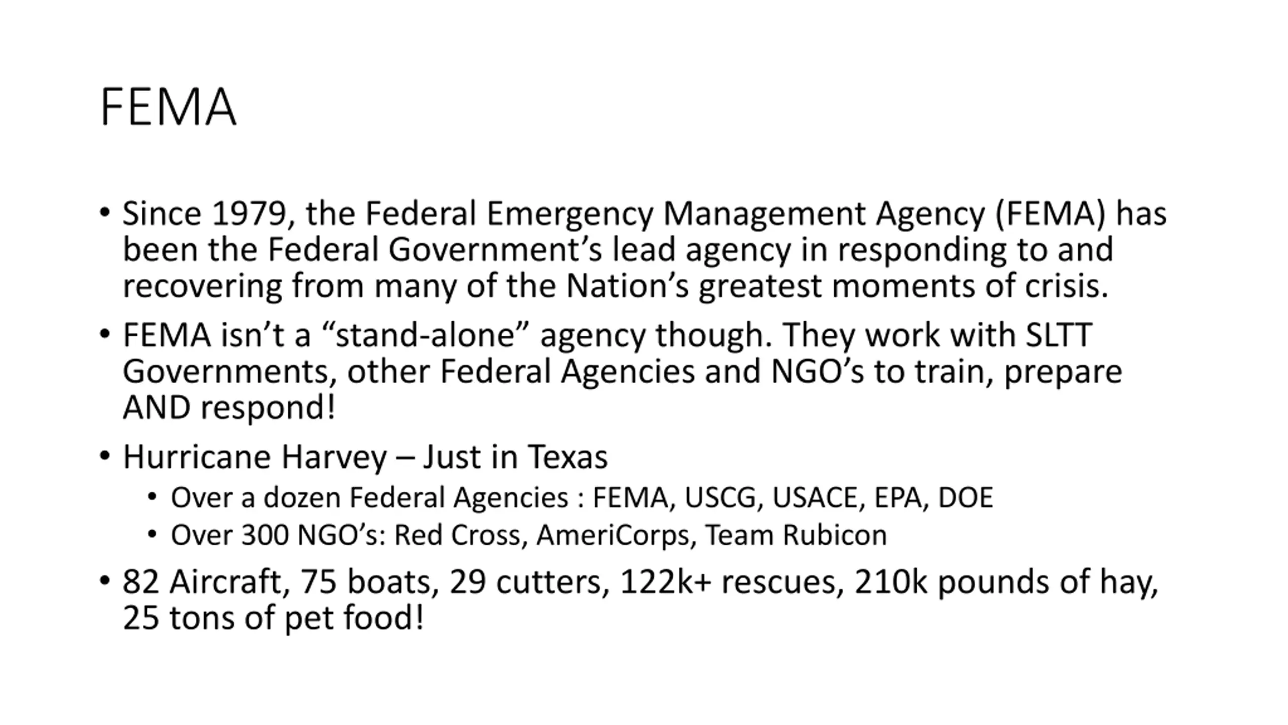 FEMA Since 1979, the Federal Emergency Management Agency (FEMA) has been the Federal Government s lead agency in responding to and recovering from many of the Nation s greatest moments of crisis. FEMA isn t a stand-alone agency though. They work with SLTT Governments, other Federal Agencies and NGO s to train, prepare AND respond! Hurricane Harvey Just in Texas Over a dozen Federal Agencies : FEMA, USCG, USACE, EPA, DOE Over 300 NGO s: Red Cross, AmeriCorps, Team Rubicon 82 Aircraft, 75 boats, 29 cutters, 122k+ rescues, 210k pounds of hay, 25 tons of pet food!