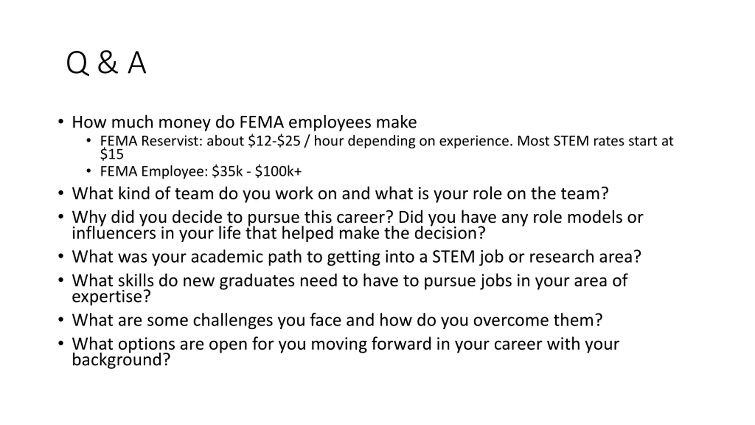 Q & A How much money do FEMA employees make FEMA Reservist: about $12-$25 / hour depending on experience. Most STEM rates start at $15 FEMA Employee: $35k - $100k+ What kind of team do you work on and what is your role on the team? Why did you decide to pursue this career? Did you have any role models or influencers in your life that helped make the decision? What was your academic path to getting into a STEM job or research area? What skills do new graduates need to have to pursue jobs in your area of expertise? What are some challenges you face and how do you overcome them? What options are open for you moving forward in your career with your background?