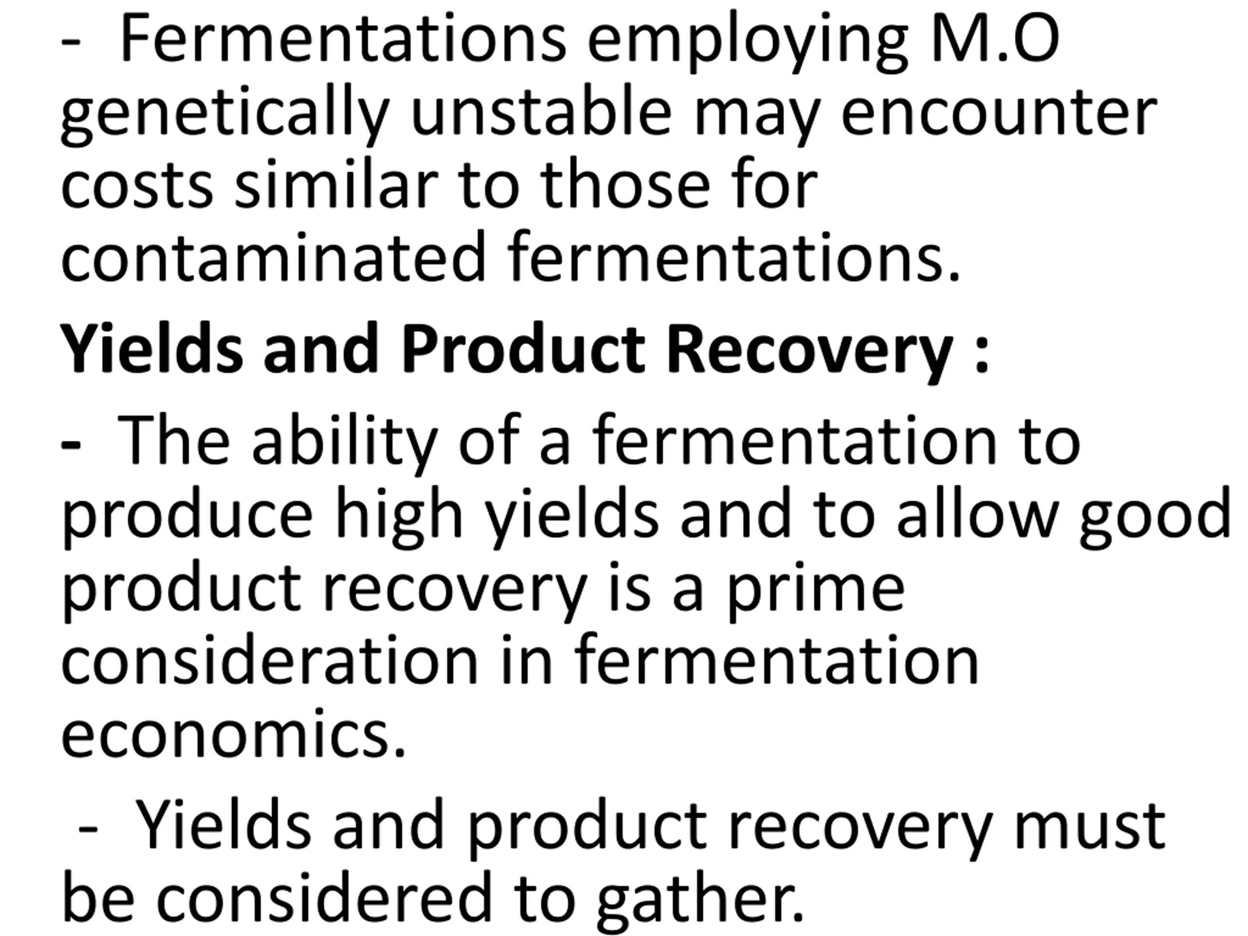 - Fermentations employing M.O genetically unstable may encounter costs similar to those for contaminated fermentations. Yields and Product Recovery : - The ability of a fermentation to produce high yields and to allow good product recovery is a prime consideration in fermentation economics. - Yields and product recovery must be considered to gather.
