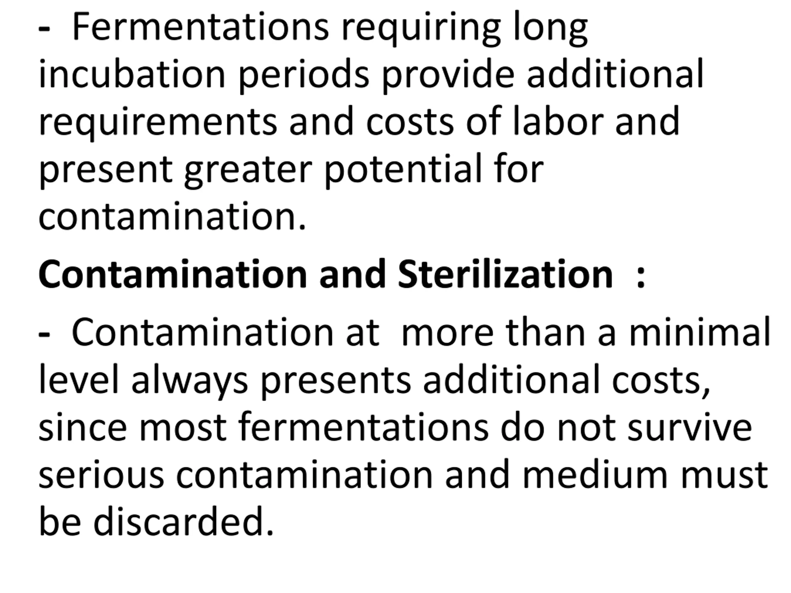 - Fermentations requiring long incubation periods provide additional requirements and costs of labor and present greater potential for contamination. Contamination and Sterilization : - Contamination at more than a minimal level always presents additional costs, since most fermentations do not survive serious contamination and medium must be discarded.