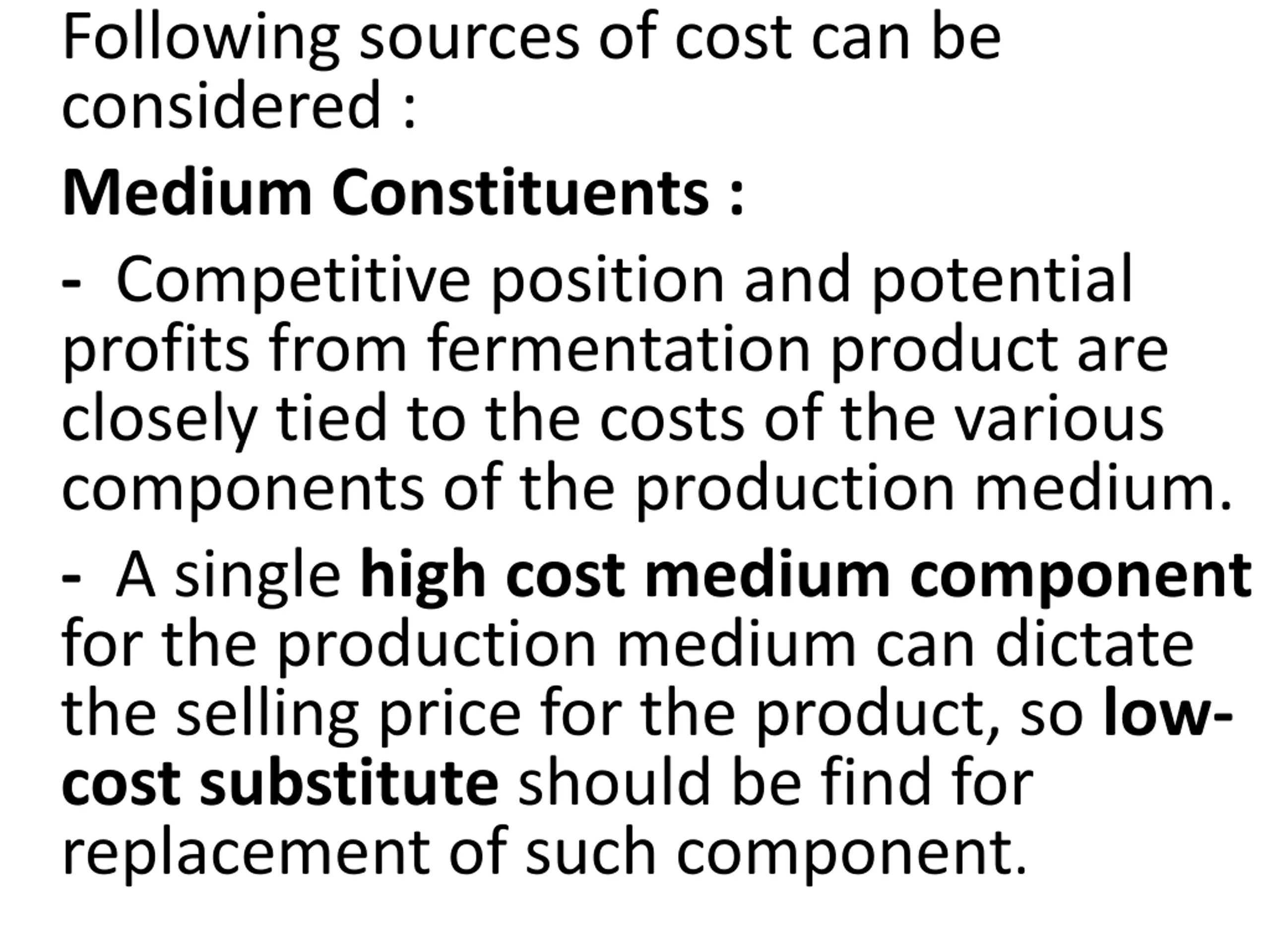 Following sources of cost can be considered : Medium Constituents : - Competitive position and potential profits from fermentation product are closely tied to the costs of the various components of the production medium. - A single high cost medium component for the production medium can dictate the selling price for the product, so low- cost substitute should be find for replacement of such component.