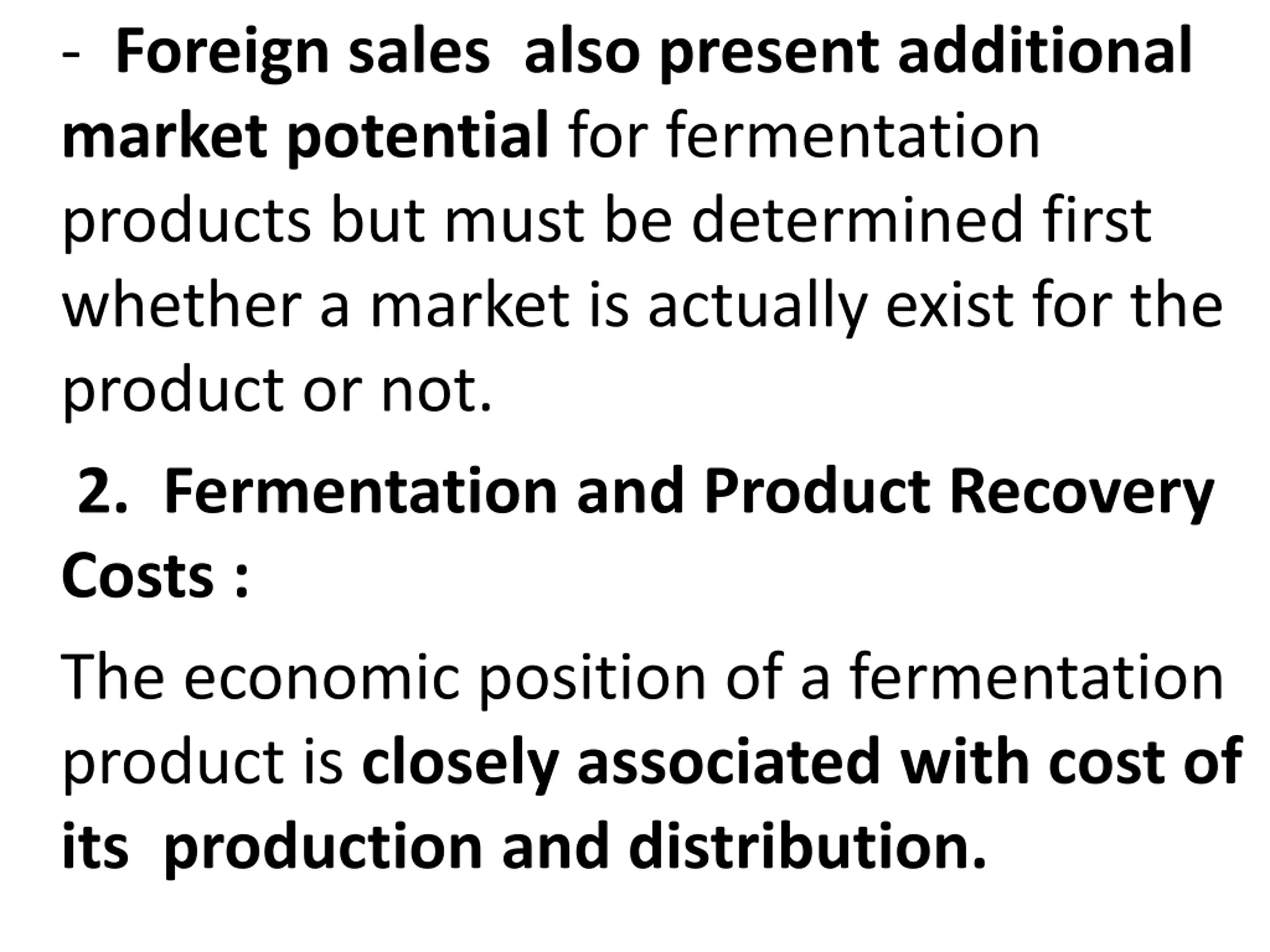 - Foreign sales also present additional market potential for fermentation products but must be determined first whether a market is actually exist for the product or not. 2. Fermentation and Product Recovery Costs : The economic position of a fermentation product is closely associated with cost of its production and distribution.