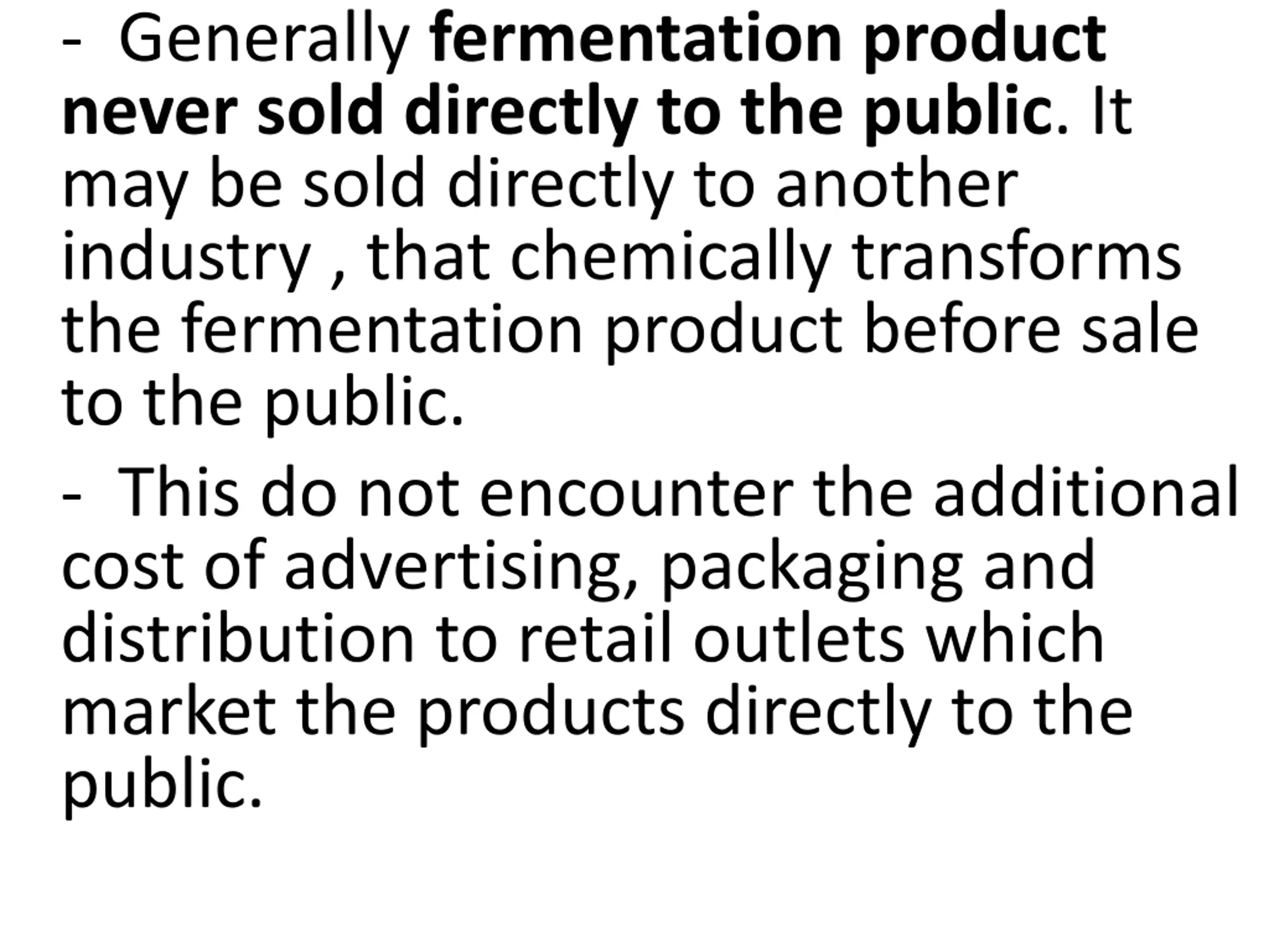 - Generally fermentation product never sold directly to the public. It may be sold directly to another industry , that chemically transforms the fermentation product before sale to the public. - This do not encounter the additional cost of advertising, packaging and distribution to retail outlets which market the products directly to the public.