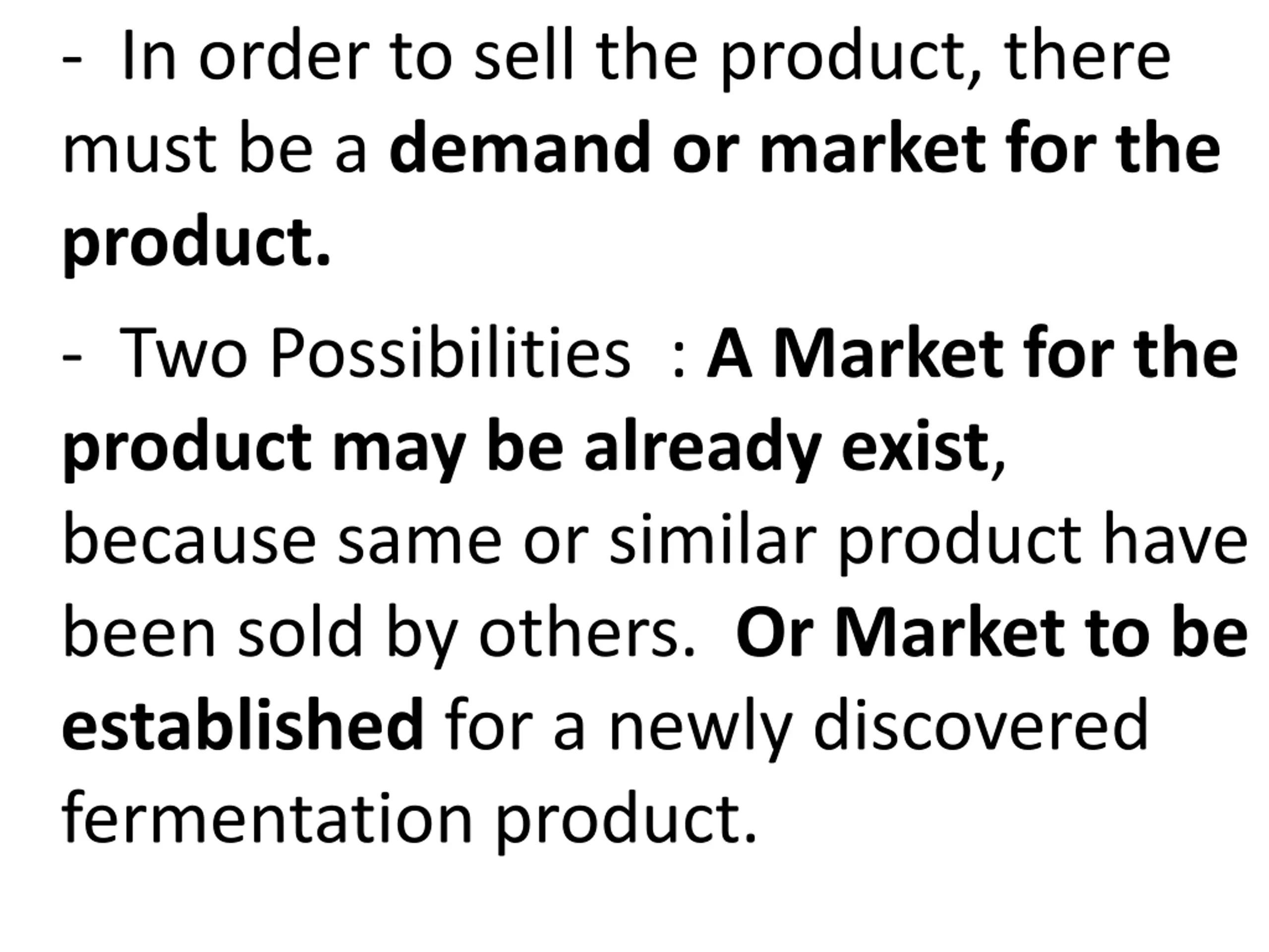 - In order to sell the product, there must be a demand or market for the product. - Two Possibilities : A Market for the product may be already exist, because same or similar product have been sold by others. Or Market to be established for a newly discovered fermentation product.