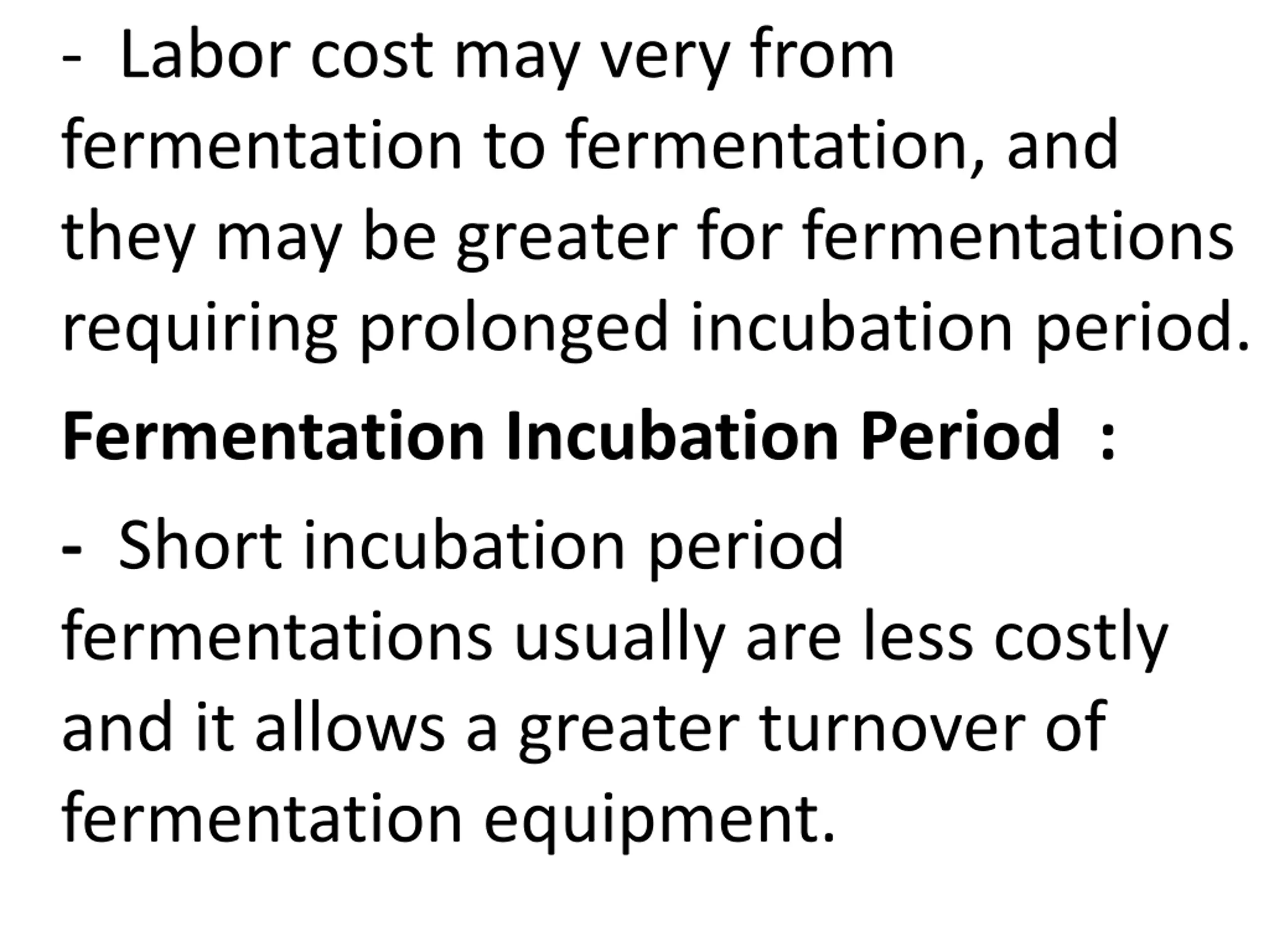- Labor cost may very from fermentation to fermentation, and they may be greater for fermentations requiring prolonged incubation period. Fermentation Incubation Period : - Short incubation period fermentations usually are less costly and it allows a greater turnover of fermentation equipment.