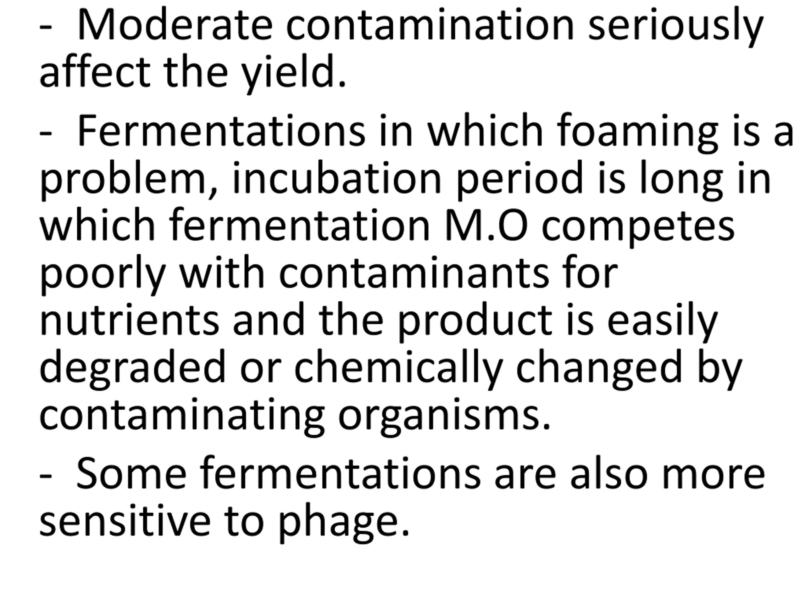 - Moderate contamination seriously affect the yield. - Fermentations in which foaming is a problem, incubation period is long in which fermentation M.O competes poorly with contaminants for nutrients and the product is easily degraded or chemically changed by contaminating organisms. - Some fermentations are also more sensitive to phage.
